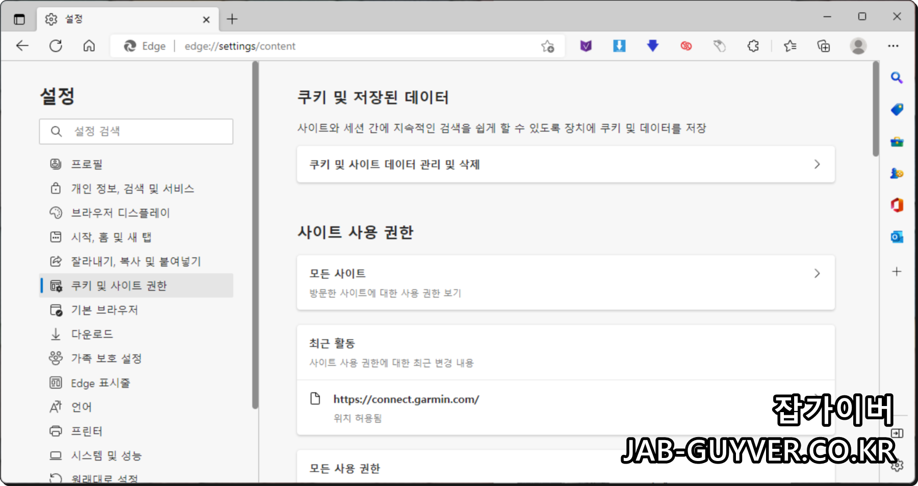 쿠키 및 사이트권한으로 들어갑니다.