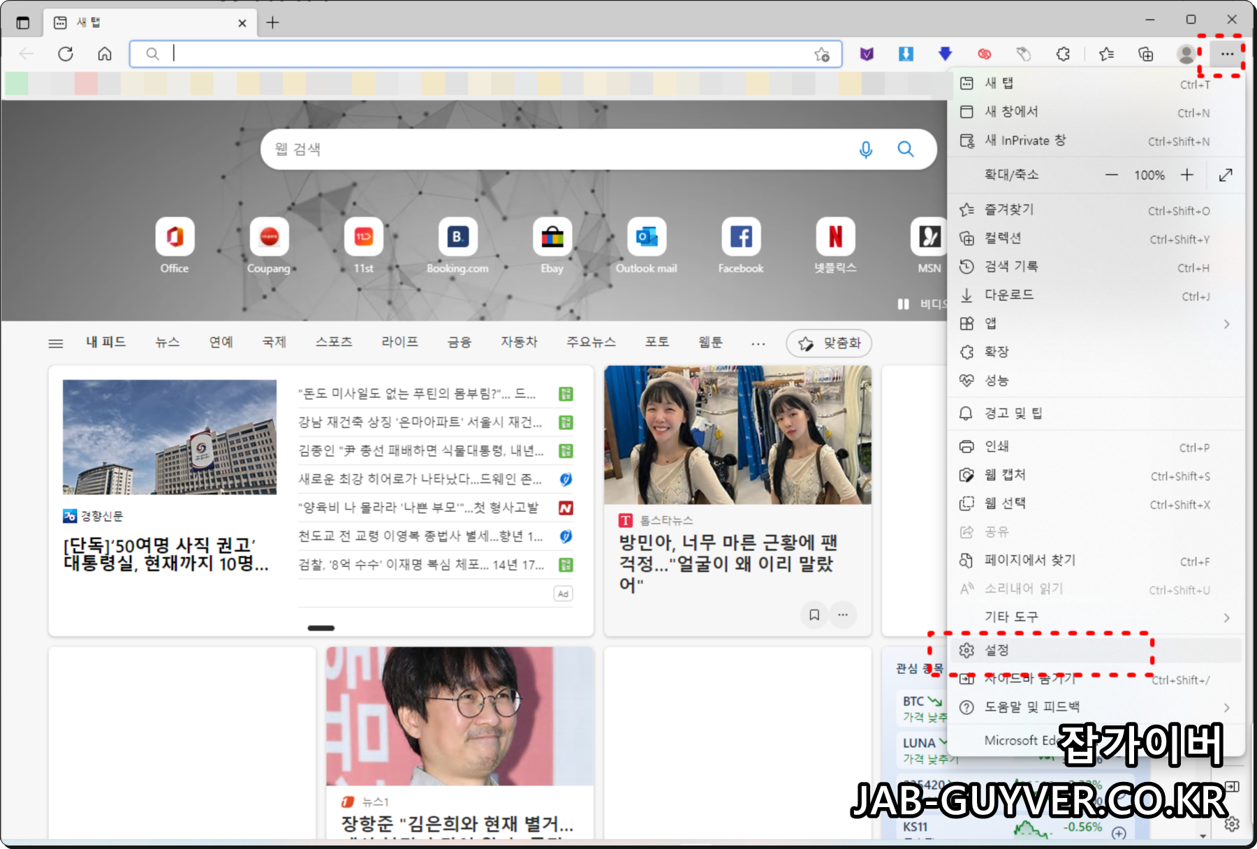 우선 마이크로소프트 엣지 브라우저를 실행 후 설정으로 들어갑니다.