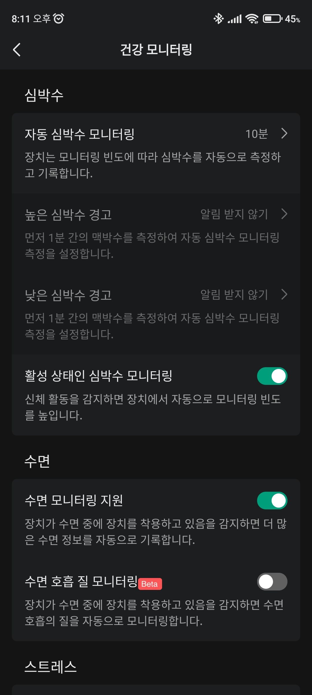 수면 측정, 심박수, SP02 측정도 24시간 자동 측정을 켜둘 수 있어서 건강이 신경 쓰이는 시기에 한동안 데이터를 모아보는 것도 괜찮습니다. 다만 24시간 측정을 모두 켜두면 배터리 사용 시간이 줄어들 수 있다는 점은 감안해야 합니다.