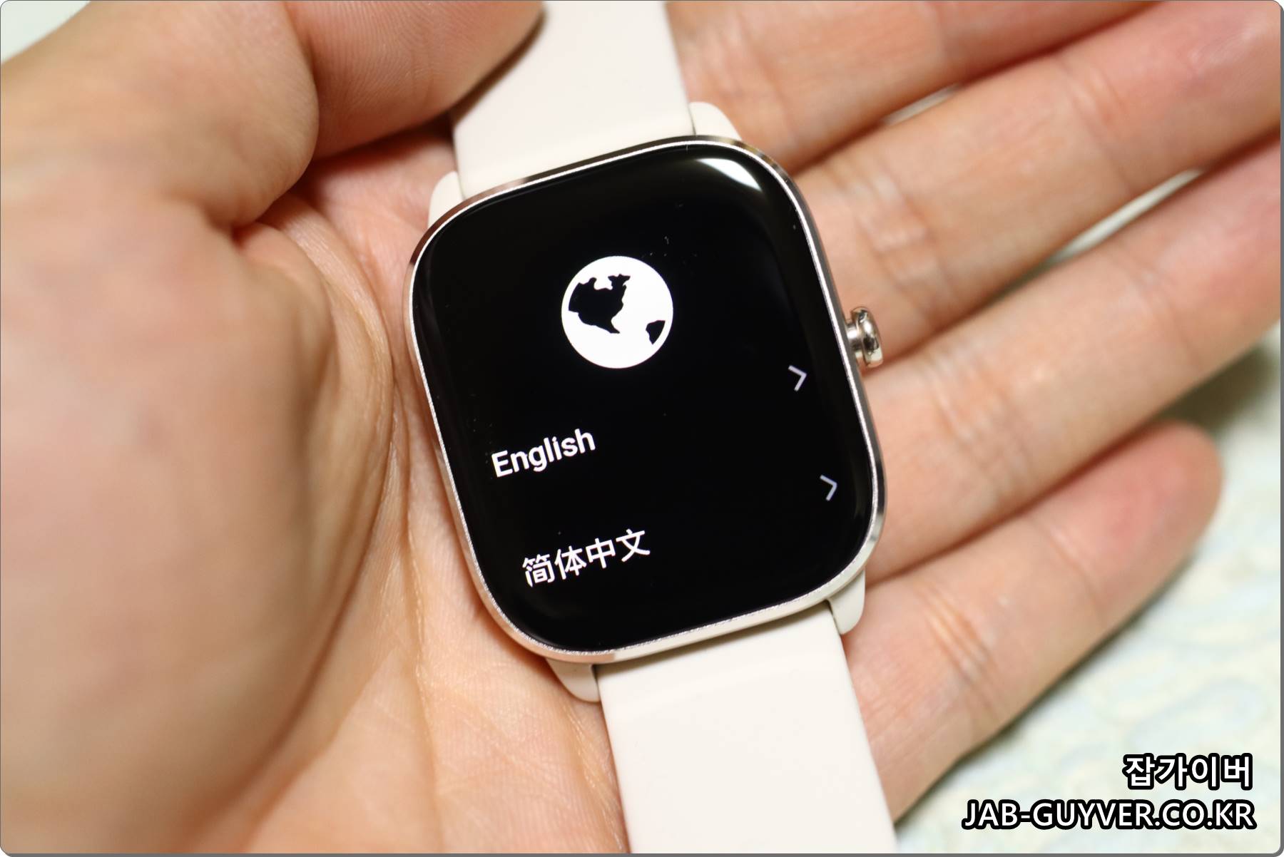 보호 스티커를 제거하고 측면 용두를 길게 눌러주면 전원이 켜지고, Zepp OS 로고와 함께 부팅이 진행됩니다. 처음에는 시계 화면에서 언어를 선택할 수 있는데, 한국어를 선택해 두면 이후 설정이 훨씬 편합니다.