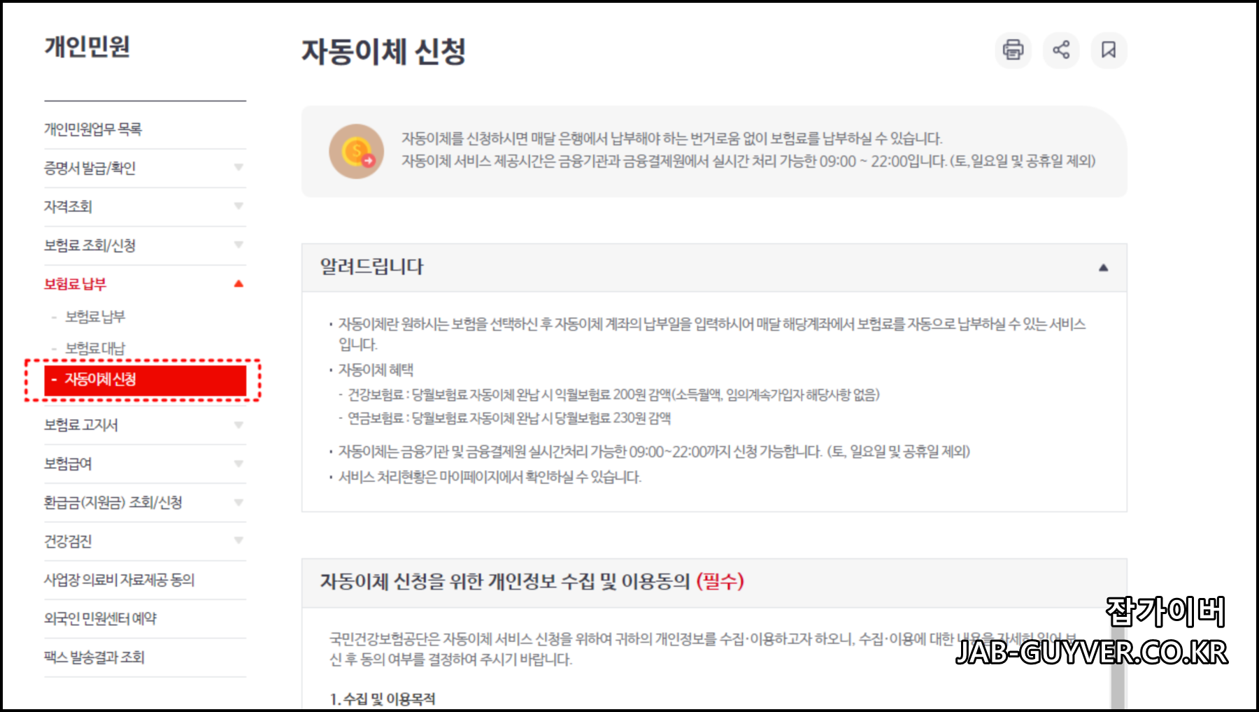 건강보험료 자동이체 신청은 매달 은행결제를 통해 납부할 필요없이 자동으로 납부가 되며 자동이체 신청은 금융기관과 금융결제원에서 실시간 처리가 가능한 9시부터 22시까지만 가능하기 때문에 밤늦게나 새벽에는 신청이 불가능하며 토요일 및 일요일 공휴일에도 신청이 불가능합니다.