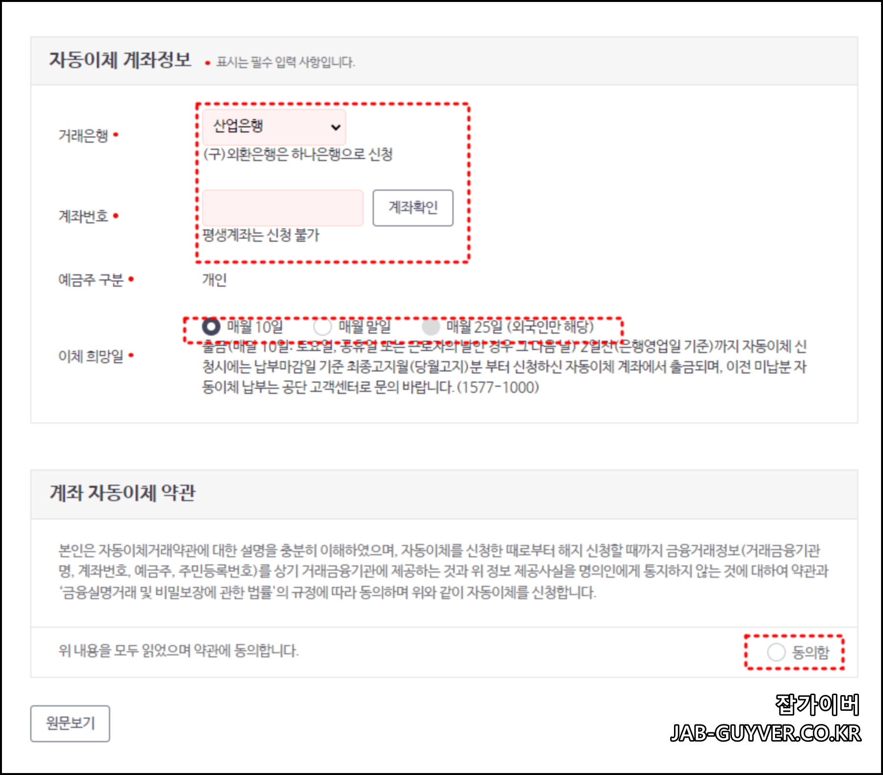자동이체를 선택 후 개인정보 수집을 모두 수락합니다.