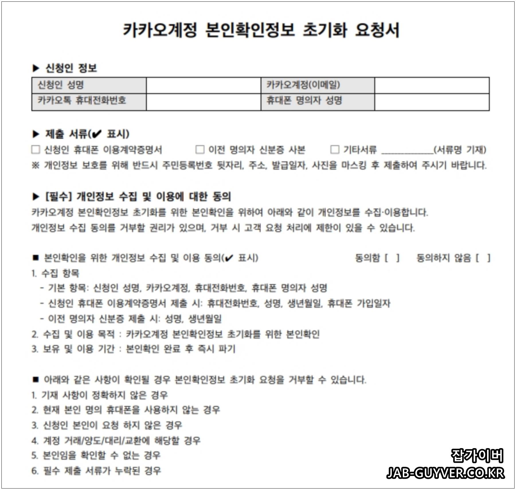 카카오계정 본인확인정보 초기화 요청서