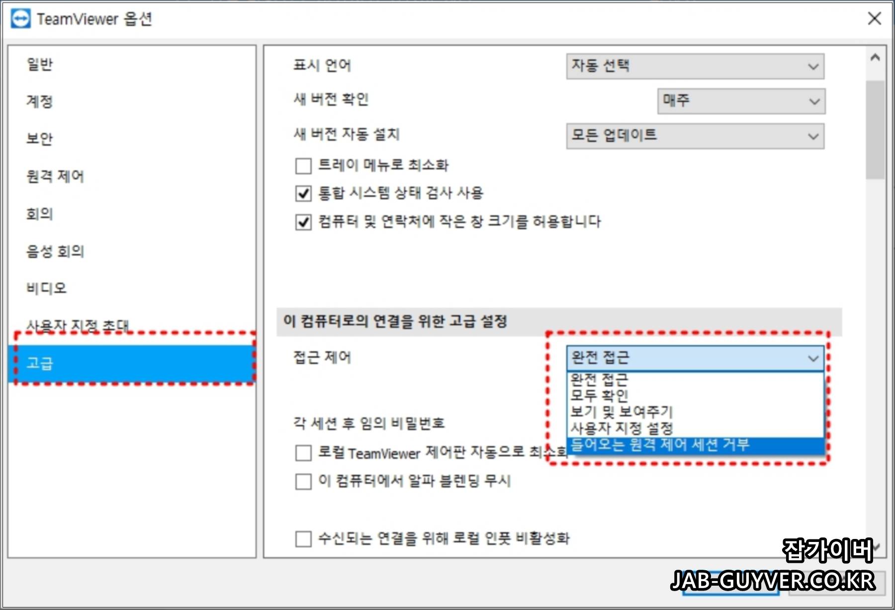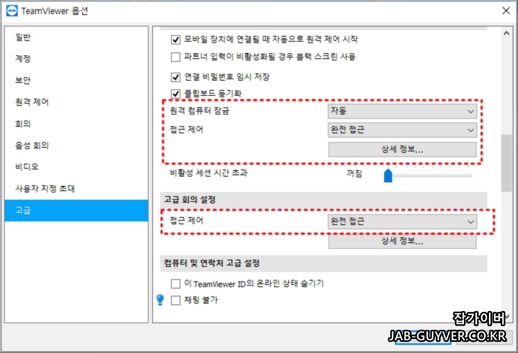 이 컴퓨터로의 연결을 위한 고급설정에서 접근제거아 들어오는 원격제어 세션거부로 되어 있다면 팀뷰어 연결이 안됩니다.
