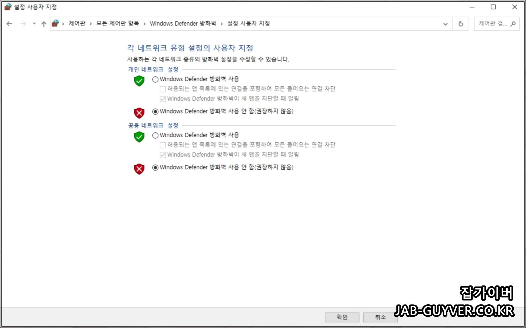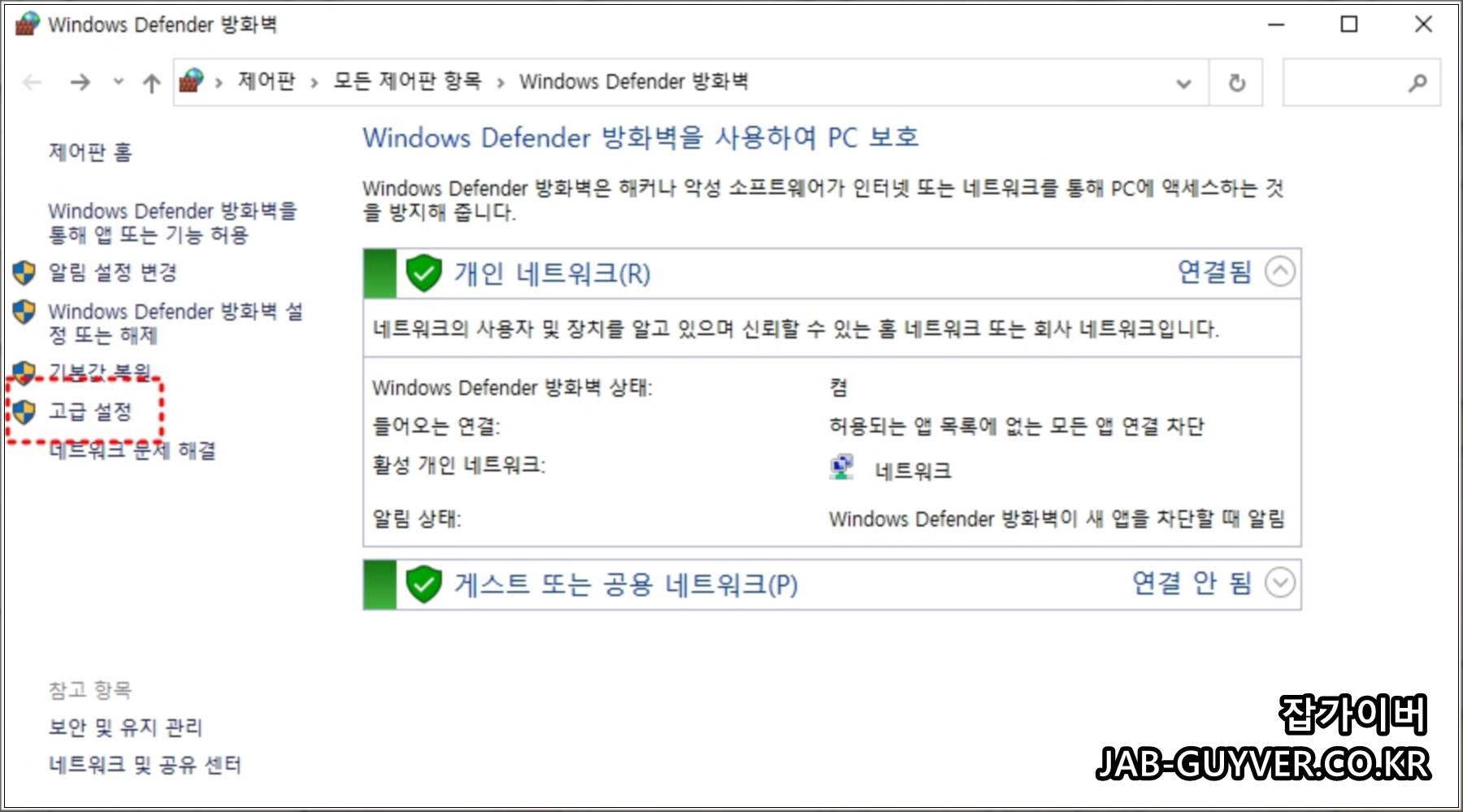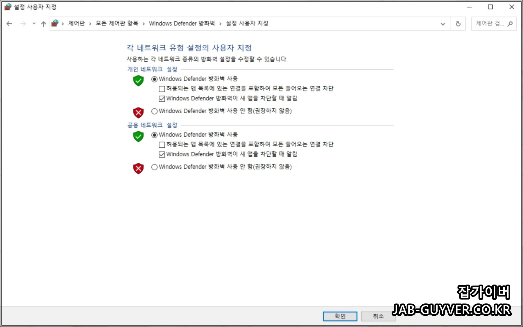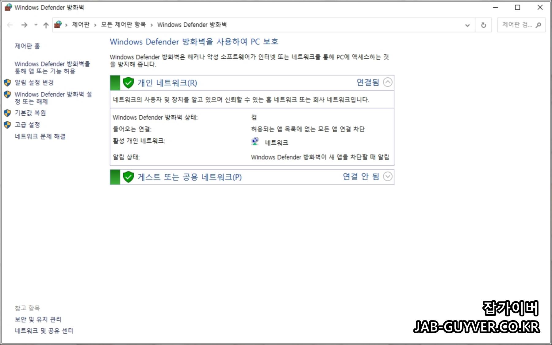 현재 개인 네트워크 및 게스트 또는 공용 네트워크가 모두 방화벽이 활성화되어 있는 상태입니다.