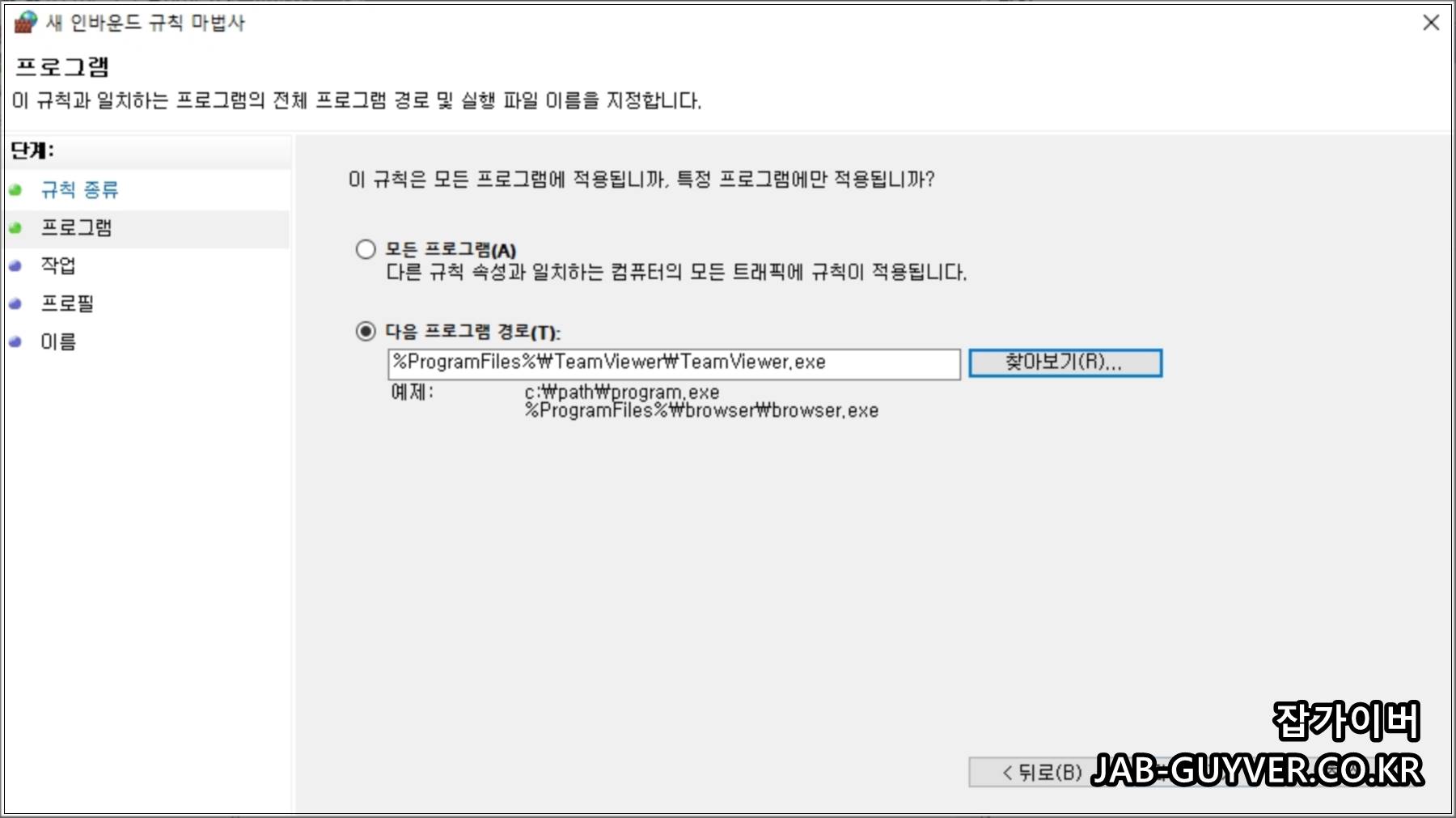 새 인바운드 규치 마법사에서 프로그램을 선택 후 팀뷰어 실행파일을 선택합니다.