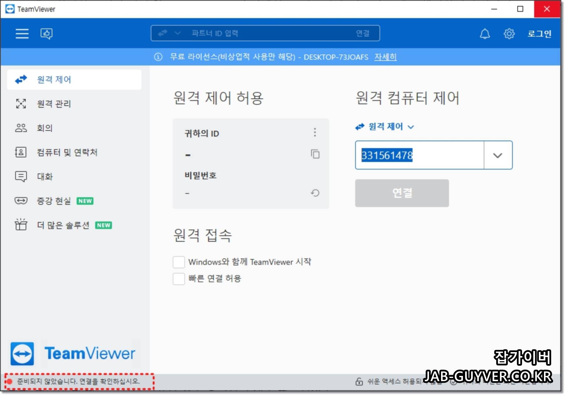 팀뷰어를 실행하면 좌측하단에 현재 팀뷰어 연결이 준비되어 있는지 연결상태를 확인할 수 있습니다.