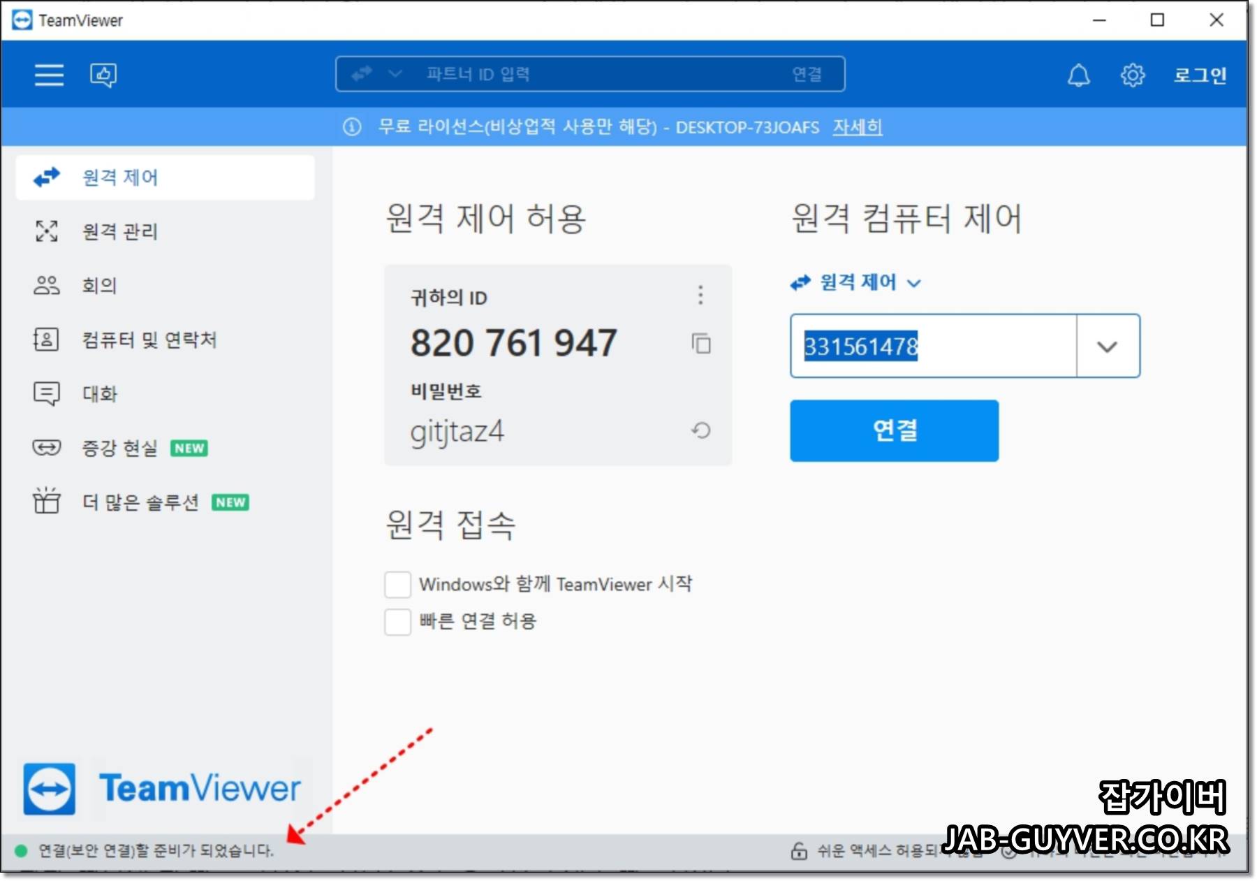 팀뷰어를 실행하면 좌측하단에 현재 팀뷰어 연결이 준비되어 있는지 연결상태를 확인할 수 있습니다.