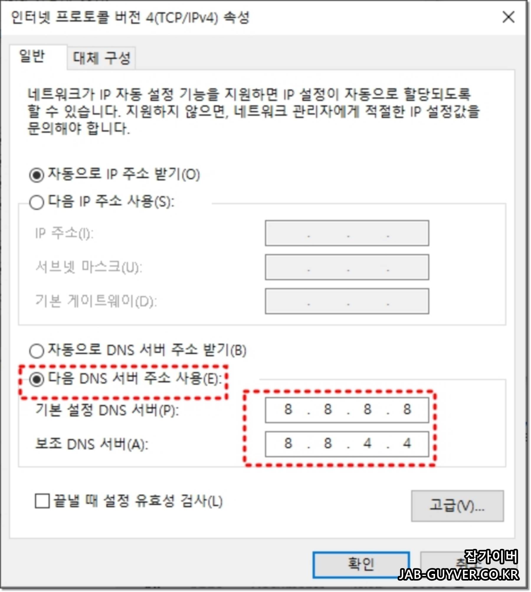 현재 자동으로 IP주소 및 DNS 주소를 받는데 DNS 서버 주소를 수동으로 구글에서 받아오느것으로 변경합니다.