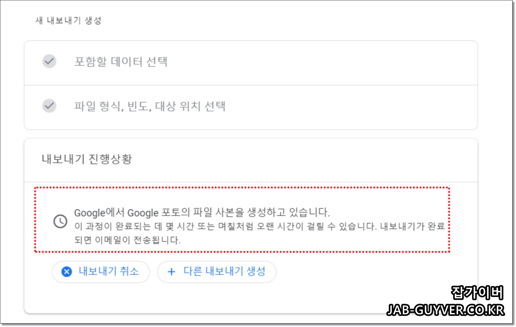 내보내기 사본을 생성 시 용량에 따라 몇시간에서 몇일이 걸릴 수 있습니다.