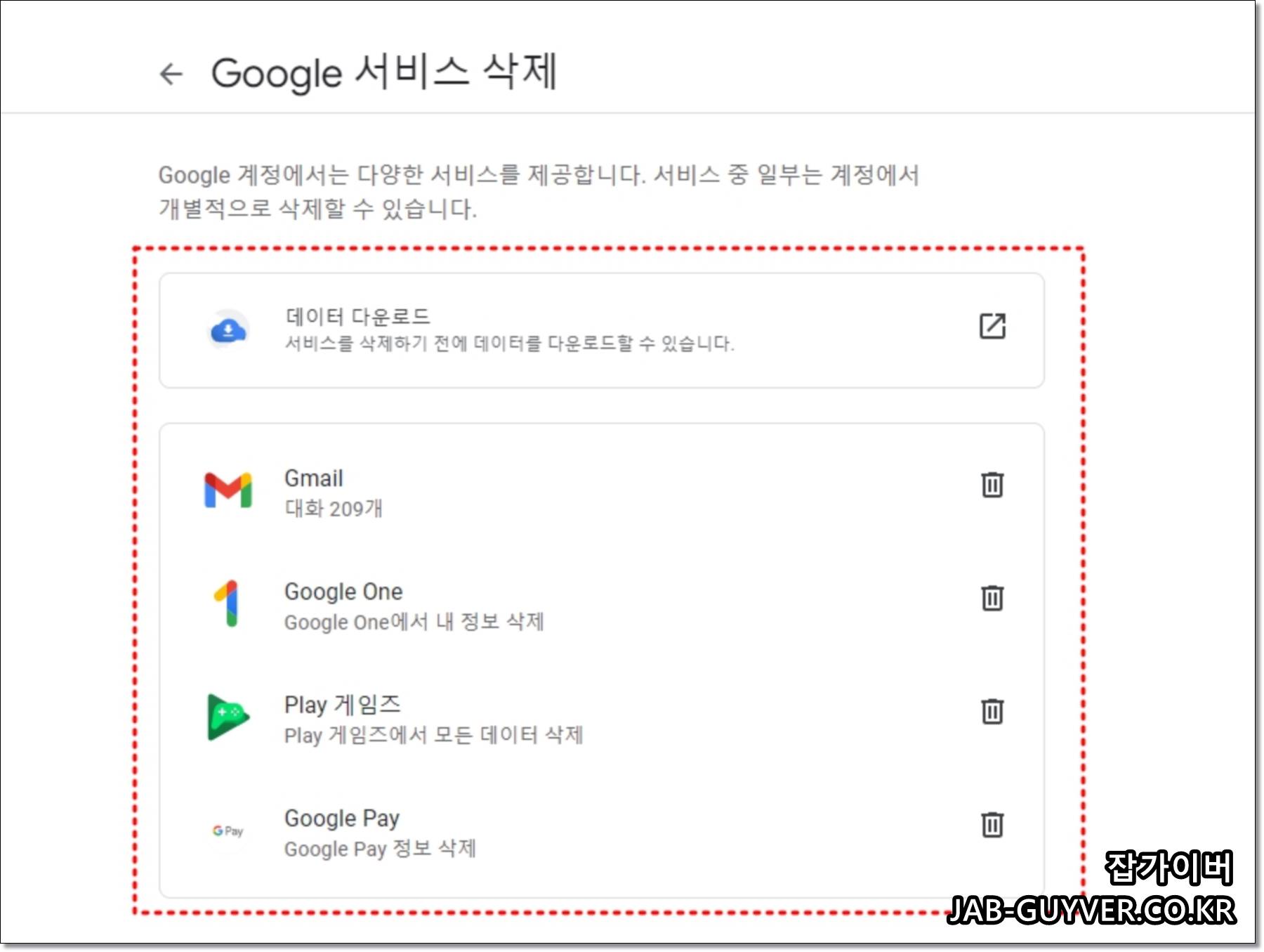 - 구글 서비스 삭제에서는 유튜브나 지메일과 같은 서비스를 삭제합니다.