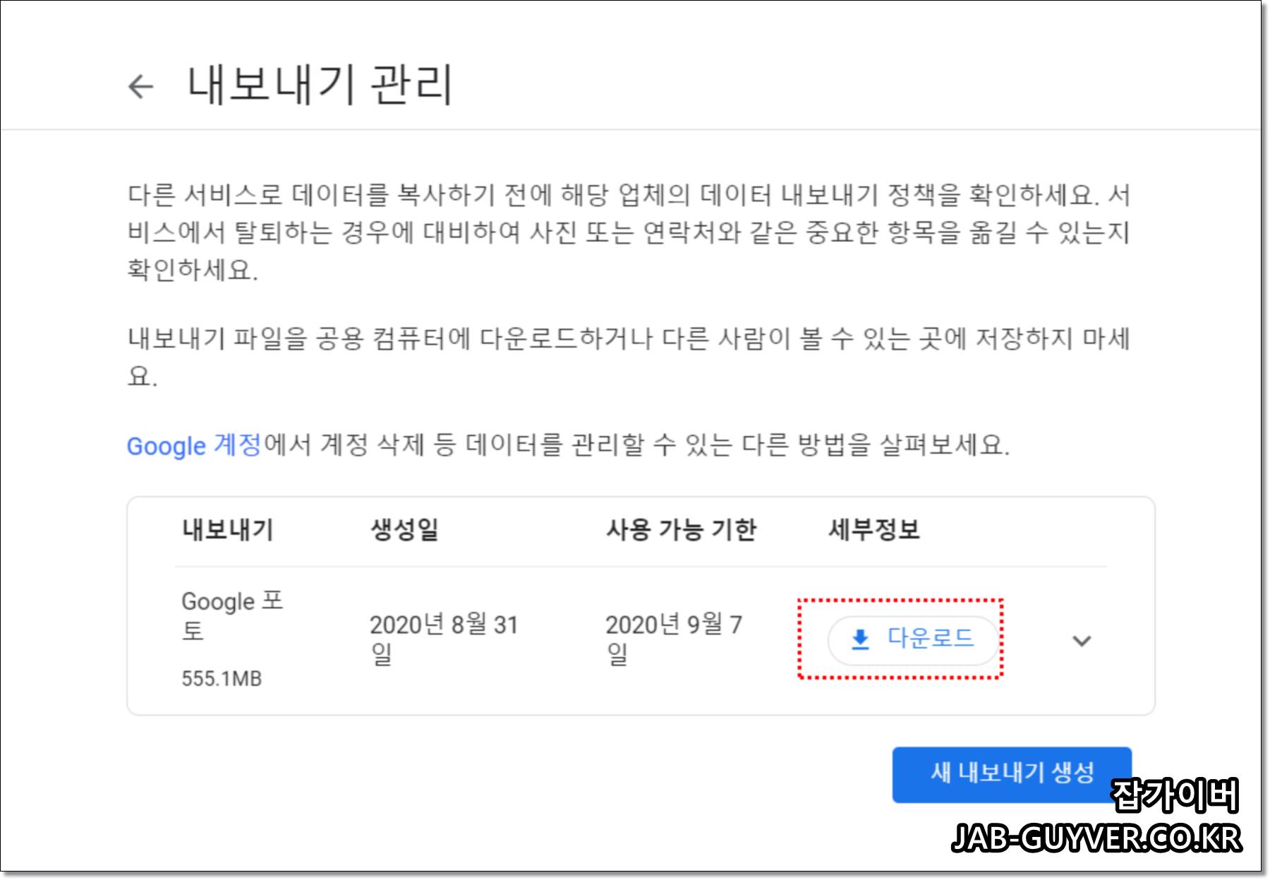 이후 내보내기 설정이 완료되었다면 다운로드를 하며 다운로드 기간 또한 정해져있기 때문에 만료전에 데이터를 백업합니다.