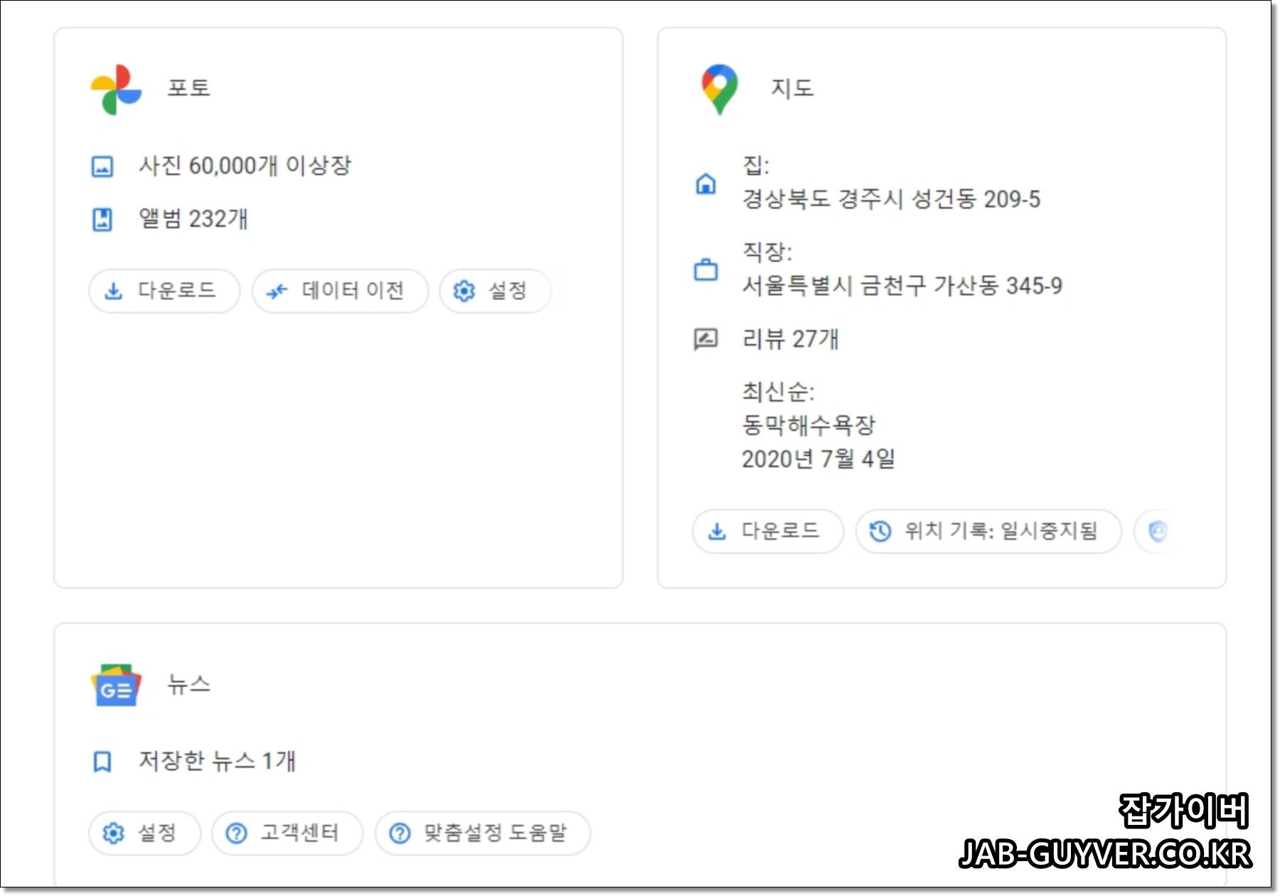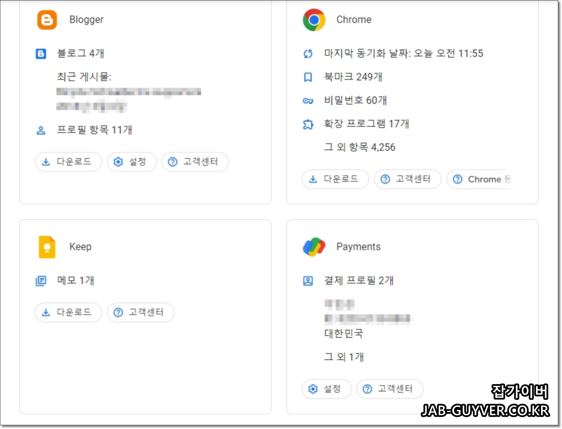 Gmail, Googel Play, Googe Drive, 캘린더, 포토, 지도등을 데이터, 그룹스, 도서, 애널리틱스, 애드센스등 다운로드 및 설정을 변경합니다