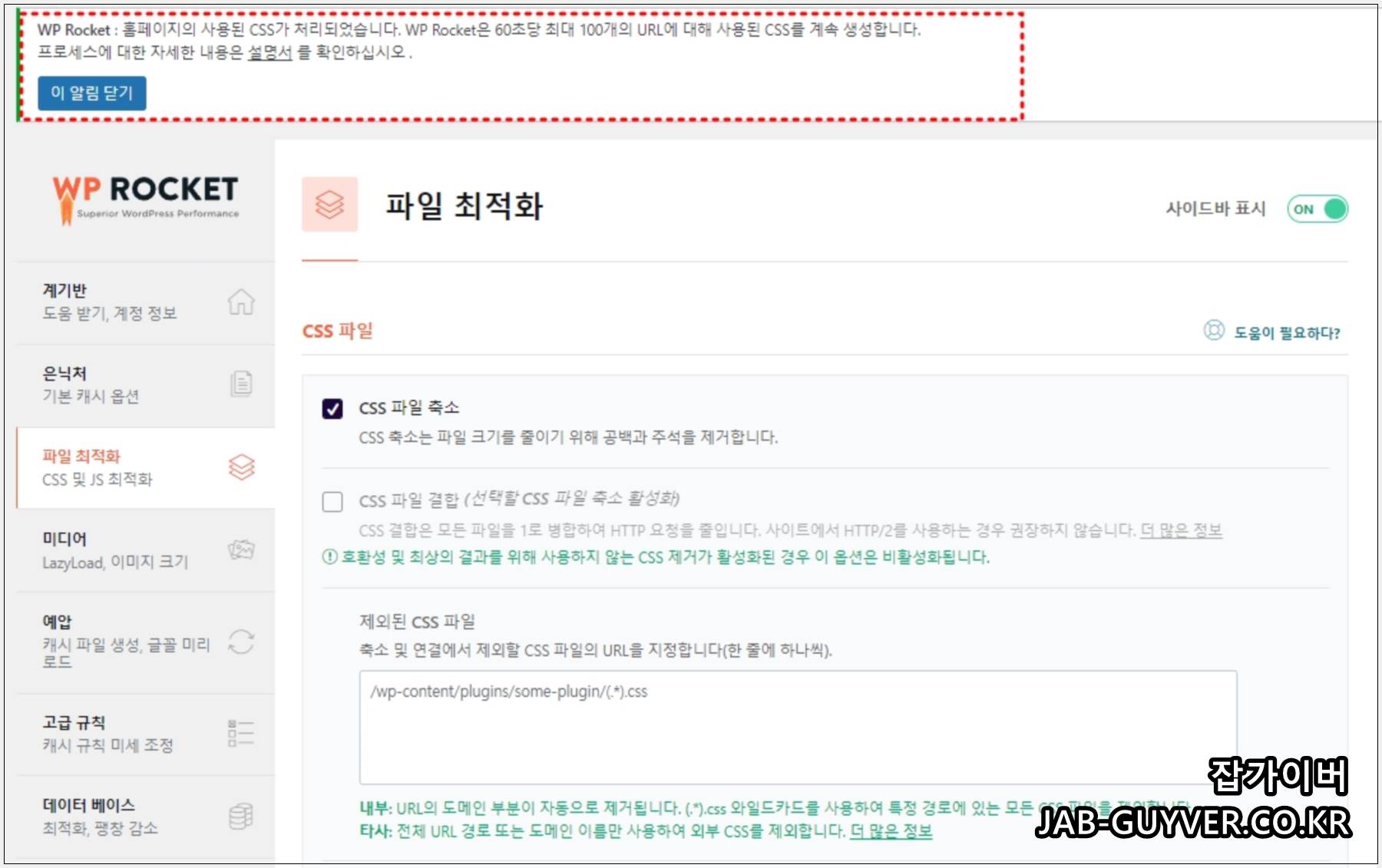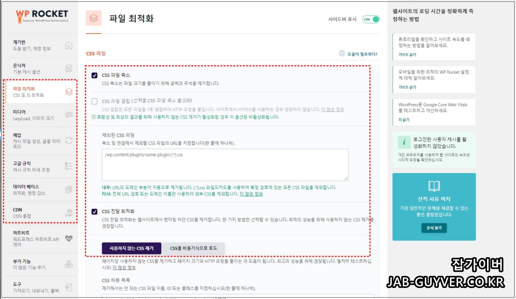 특히 테마에서도 자체적으로 자바스크립트 압축이나 이미지 지연등이 중복기능이 있기 때문에 하나만 활성화 해주느것이 좋습니다.
