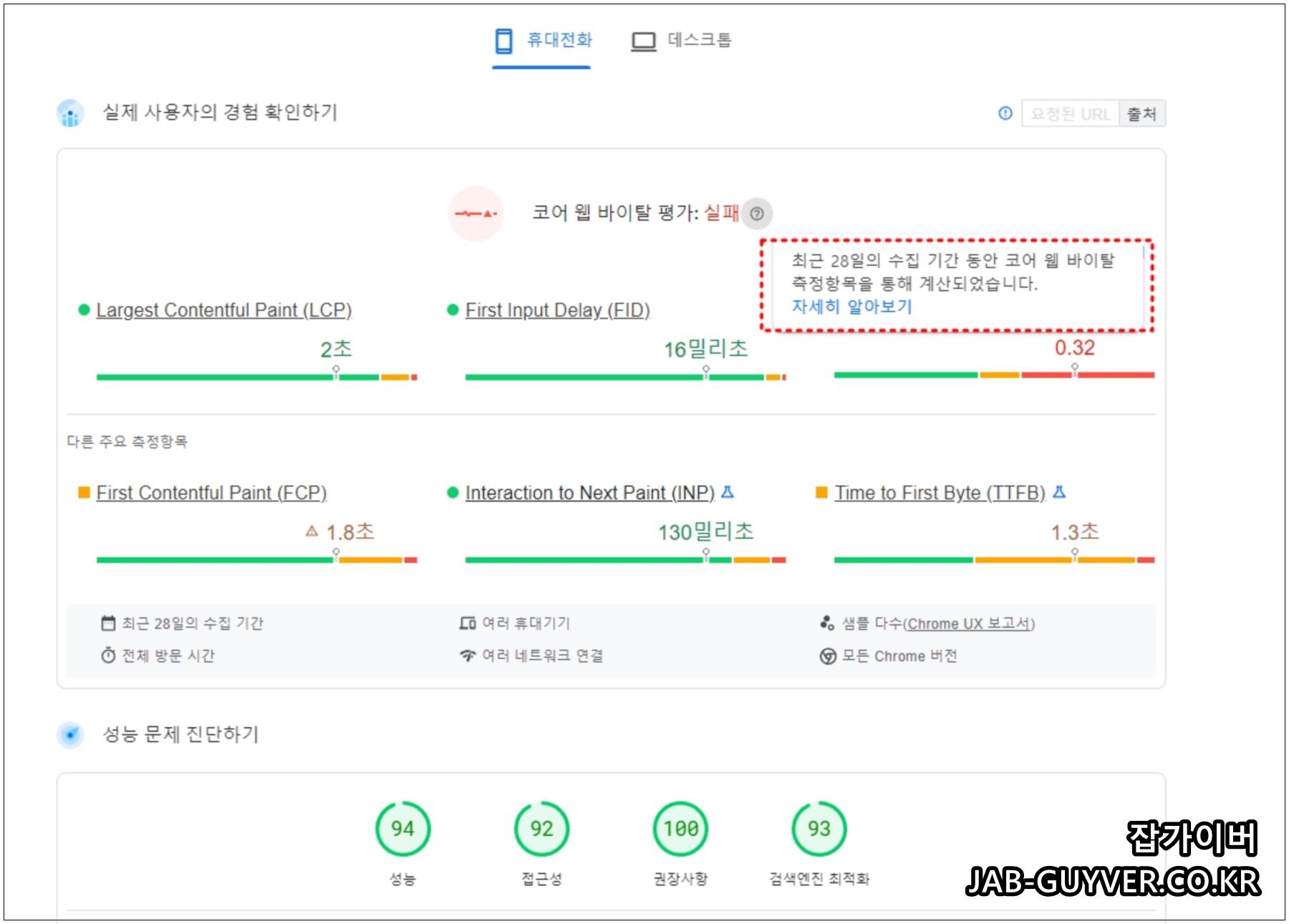 코어 웹 바이탈 평가는 최근 28일 수집기준으로 평가되기 때문에 바로 표시되지 않을 수 있습니다.