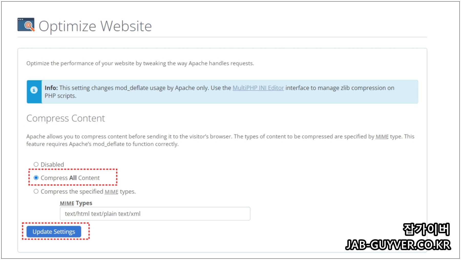 Optimzie Websit를 통해 Compress ALL Content를 압축합니다.