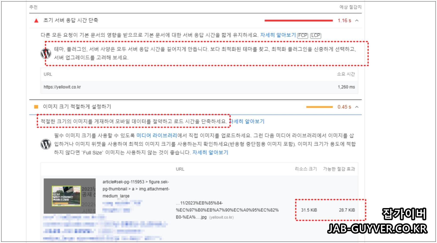 워드프레스 SEO 최적화 속도측정 및 페이지 크기 압축