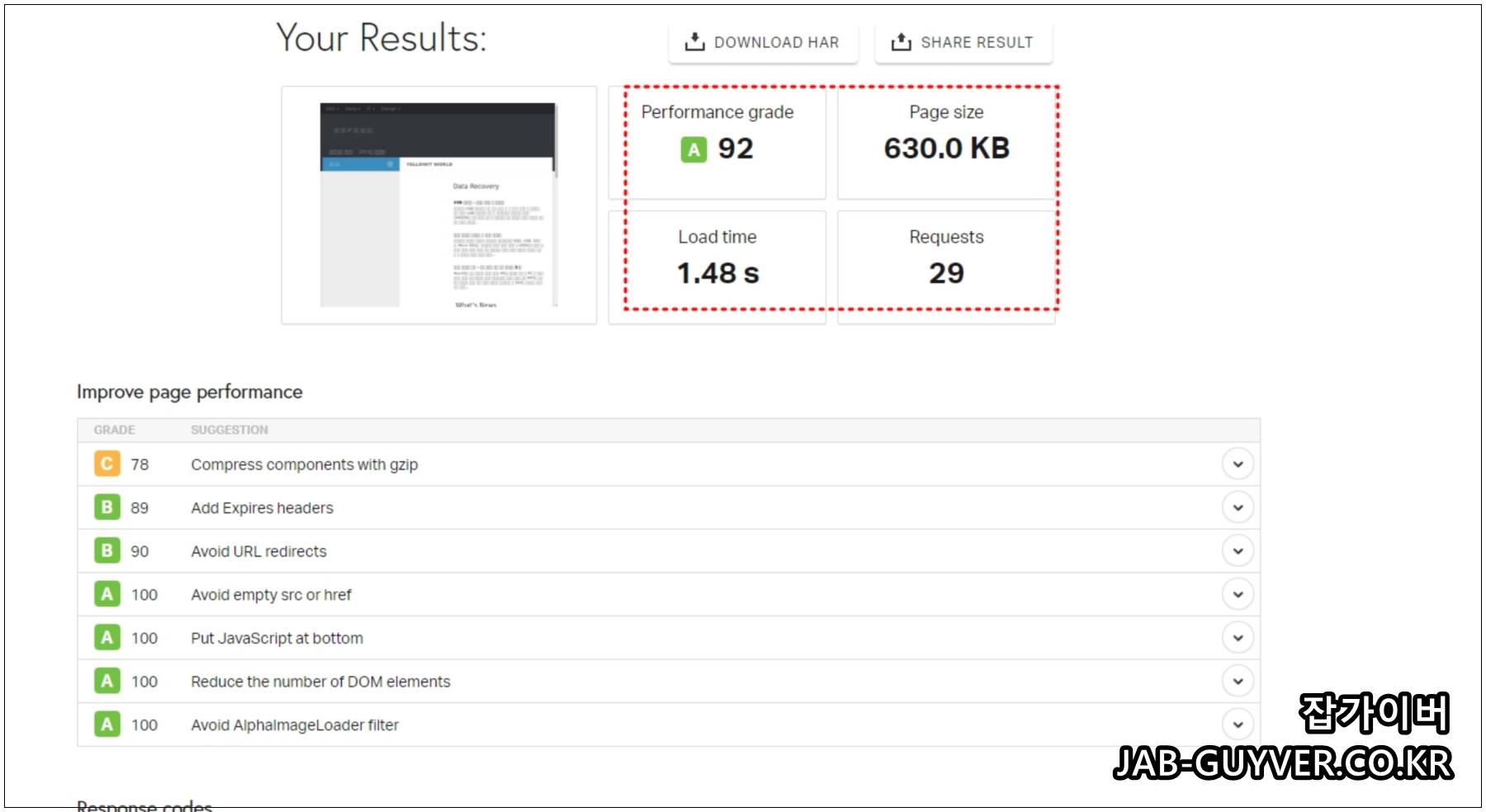 현재 웹페이지 접속속도를 A,B,C,D,E 등으로 표시되고 페이지 크기 및 로드시간 요청횟수등을 확인할 수 있습니다.