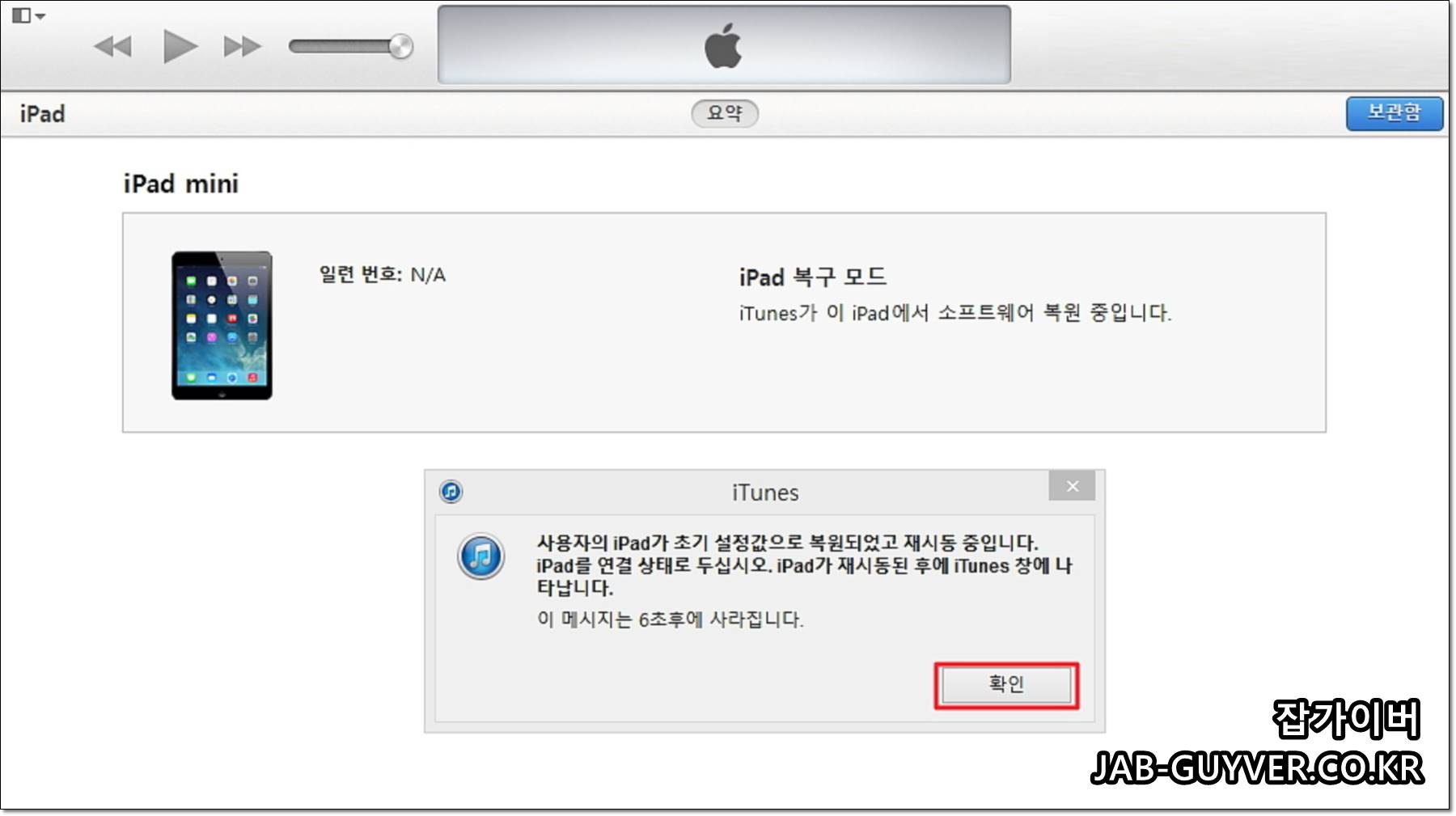 그럼 아이튠즈에서 아이패드 DFU 초기화 알림이 아이튠즈 화면에 표시되면서 아이패드 미니 & 에어 & 프로 모델 뿐만 아니라 아이폰 DFU 초기화를 할 수 있습니다.