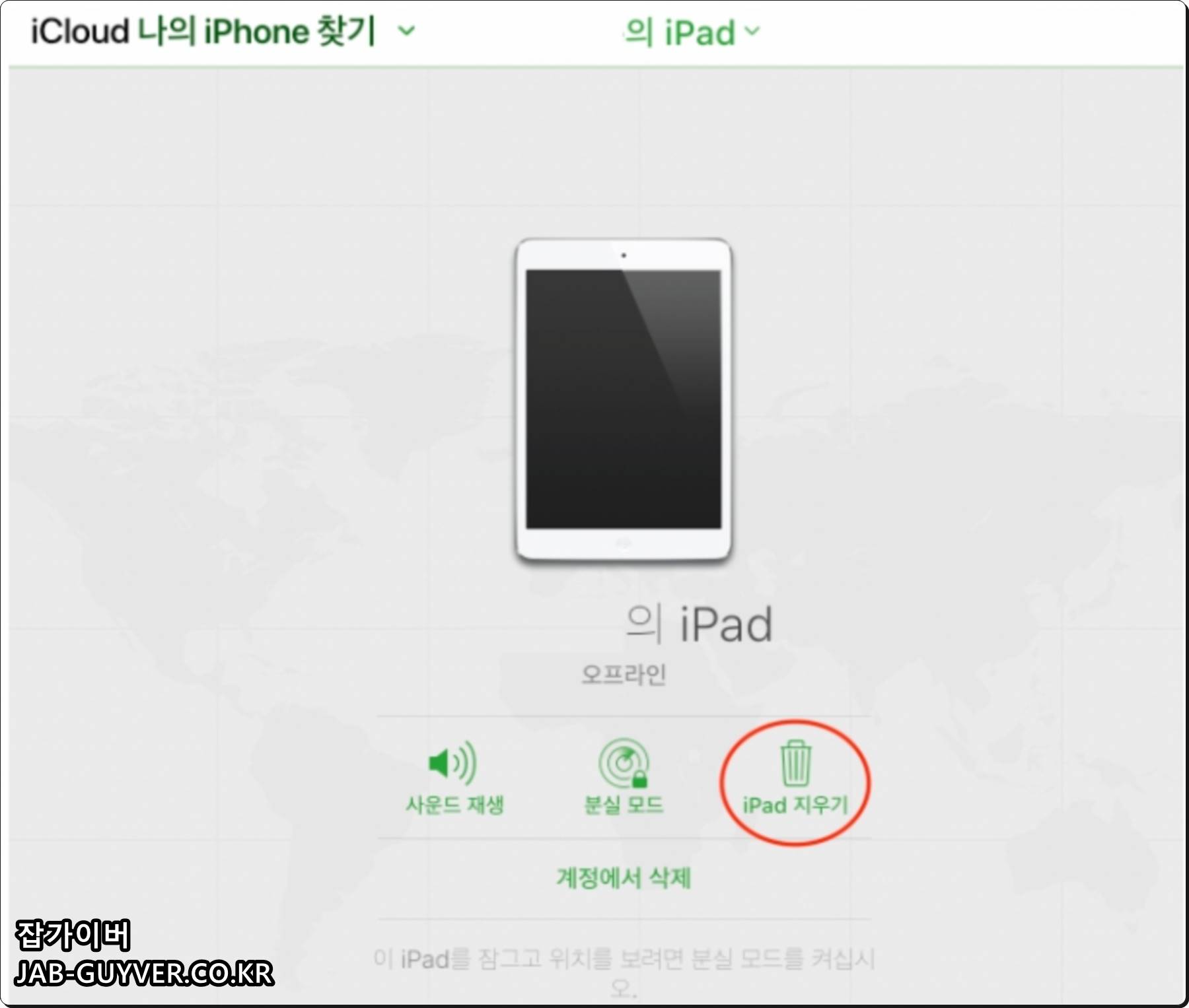 그 외에도 원격으로 아이폰 초기화 및 아이패드 초기화를 하고 싶다면 iPAD 지우기를 눌러주면 원격으로 데이터를 포맷할 수 있으며 등록된 애플계정을 삭제하고 싶다면 계정에서 삭제를 눌러줍니다.