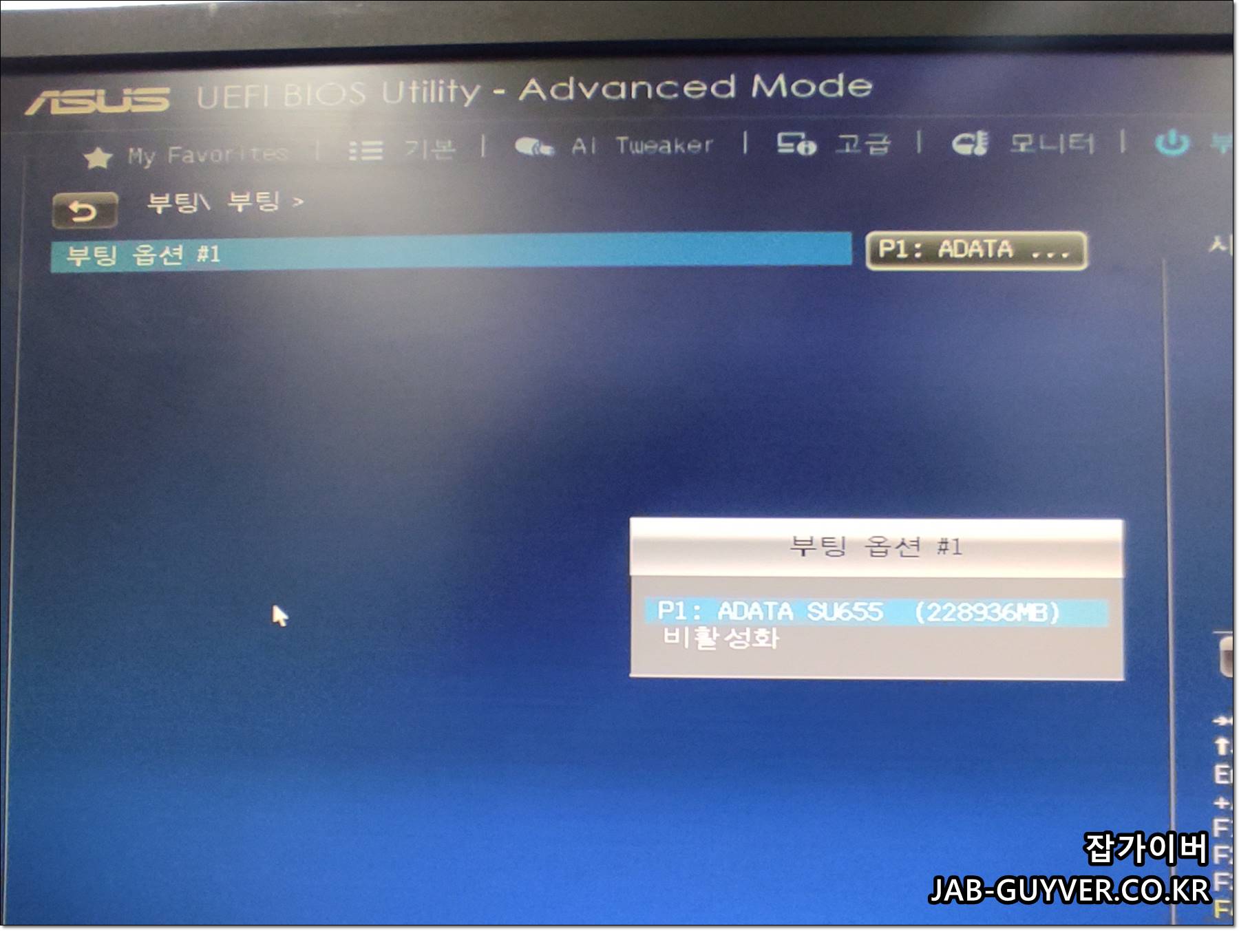 만약 컴퓨터에 연결 된 하드디스크 및 SSD를 모두 제거하는게 어렵다면 CMOS 설정에서 부팅순서를 윈도우 설치할 파티션을 가장 최상단으로 설정합니다.