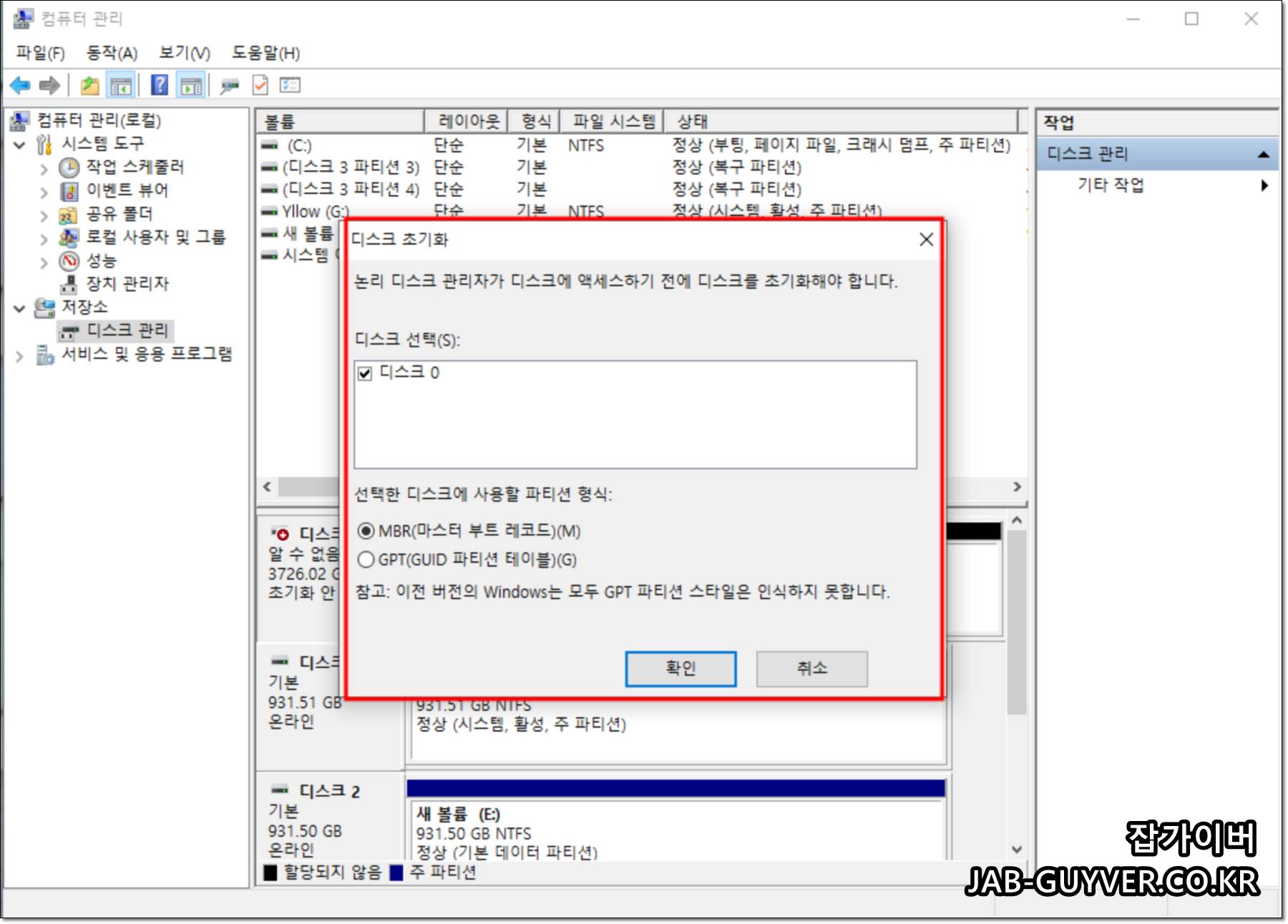 이후 파티션을 GPT "GUID 파티션 테이블"로 초기화 후 파티션을 새롭게 활성화합니다.