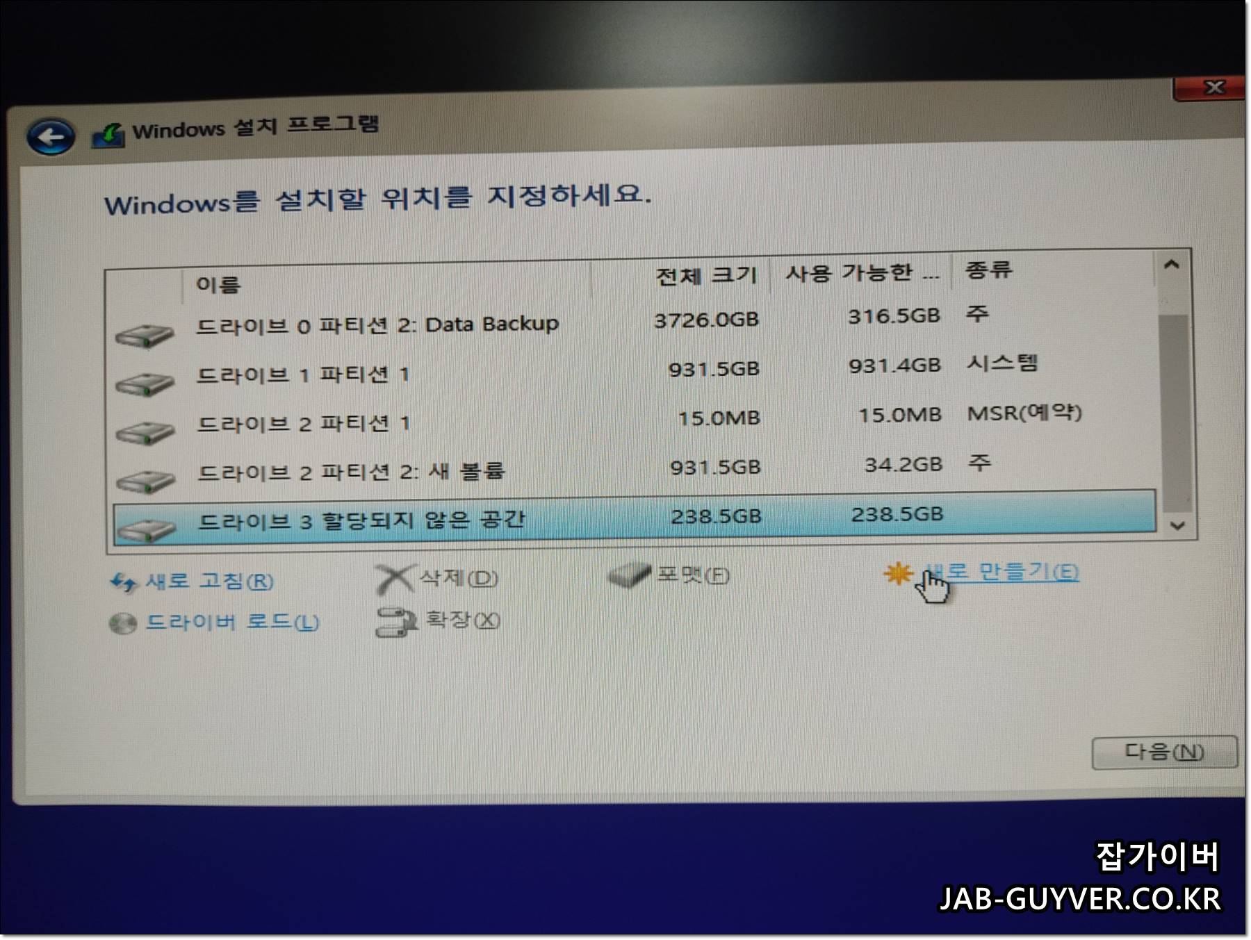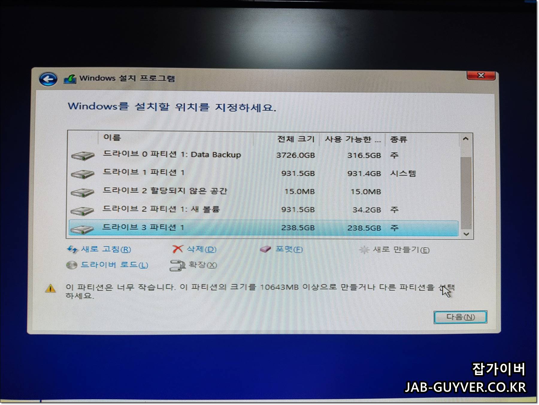 그리고 문제의 화면으로 Windws 설치 프로그램에서 윈도우를 설치할 파티션을 선택합니다.