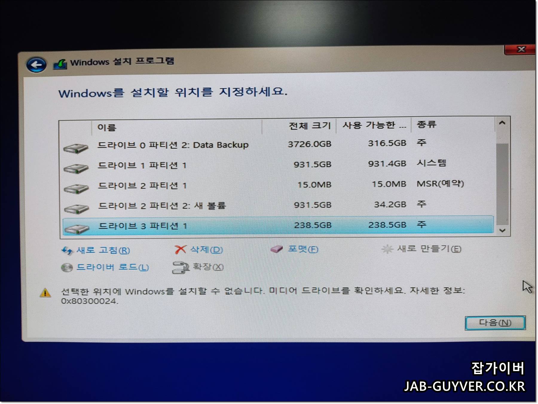 선택한 위치에 Windows를 설치할 수 없습니다. 0x80300024