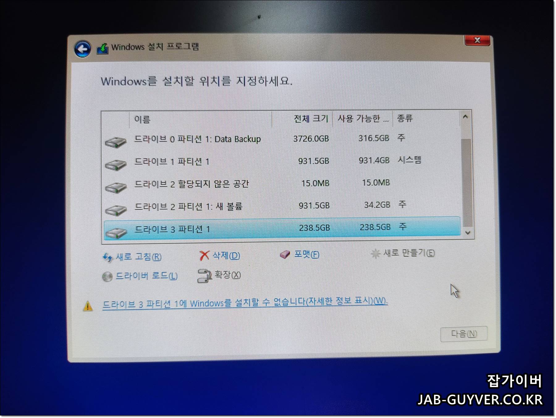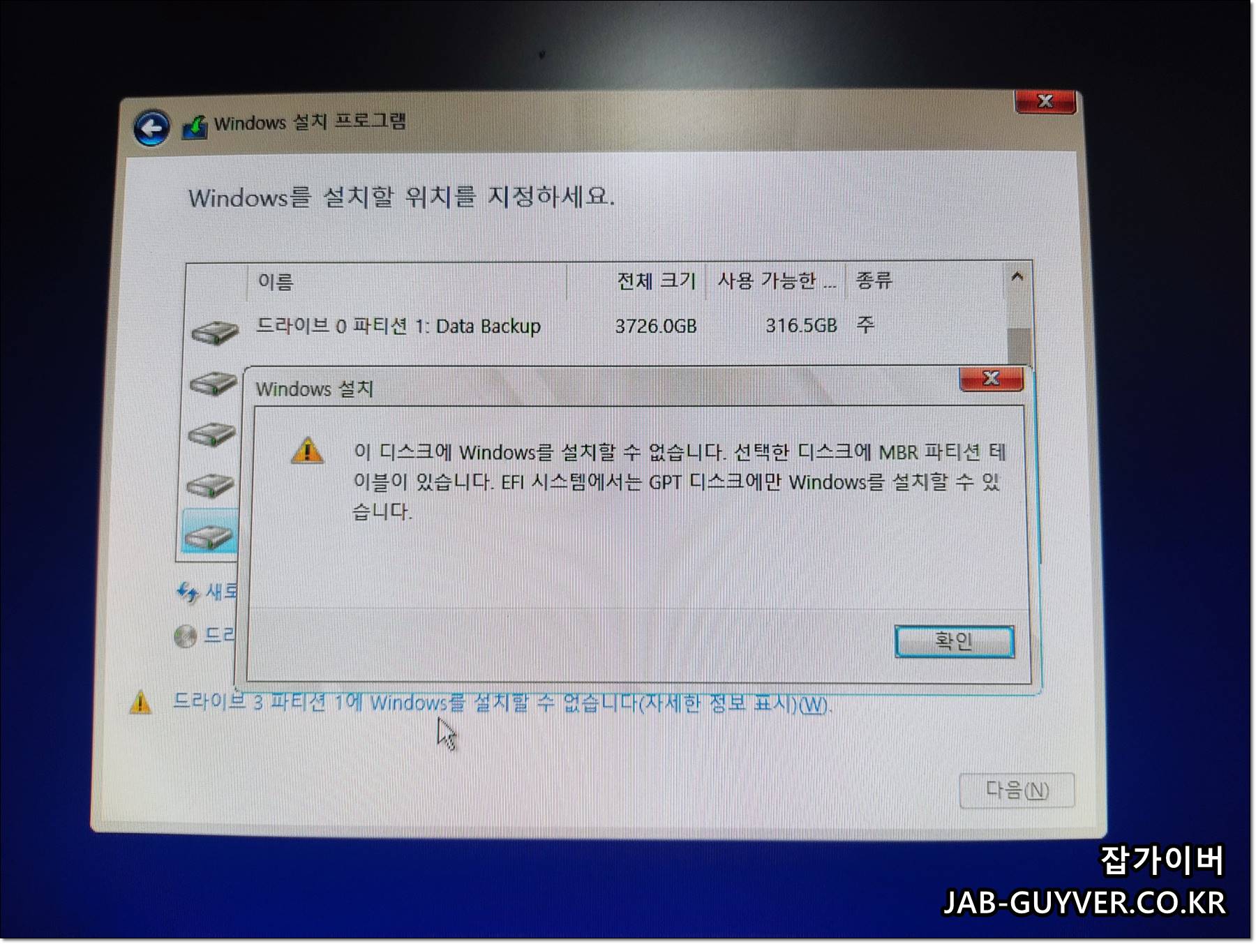 드라이브 0 파티션 1에 windows를 설치할 수 없습니다와 같은 파티션 넘버에 따른 알림이 뜨기도합니다.