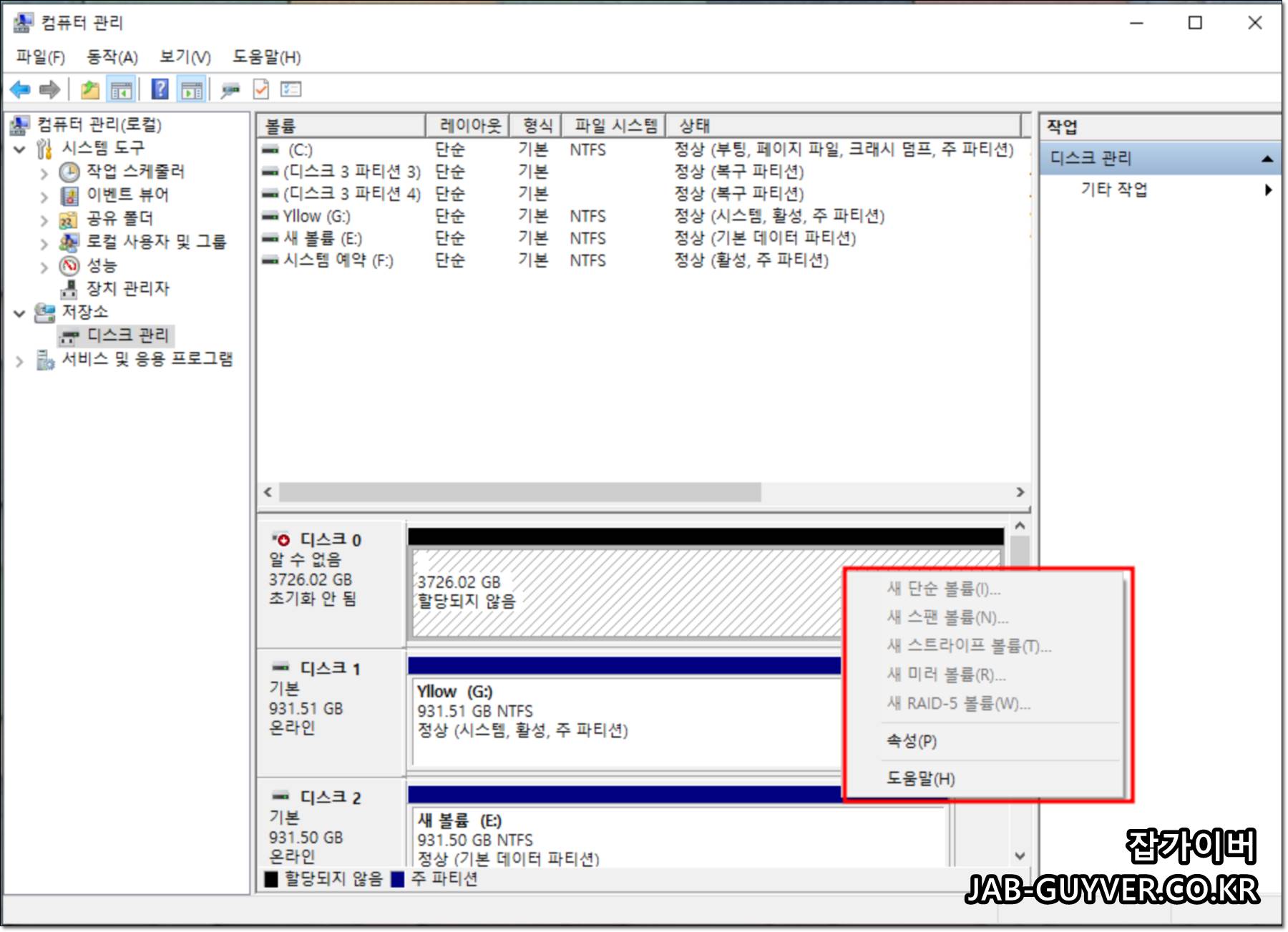 컴퓨터 관리 -> 저장소 -> 디스크관리로 들어갑니다.