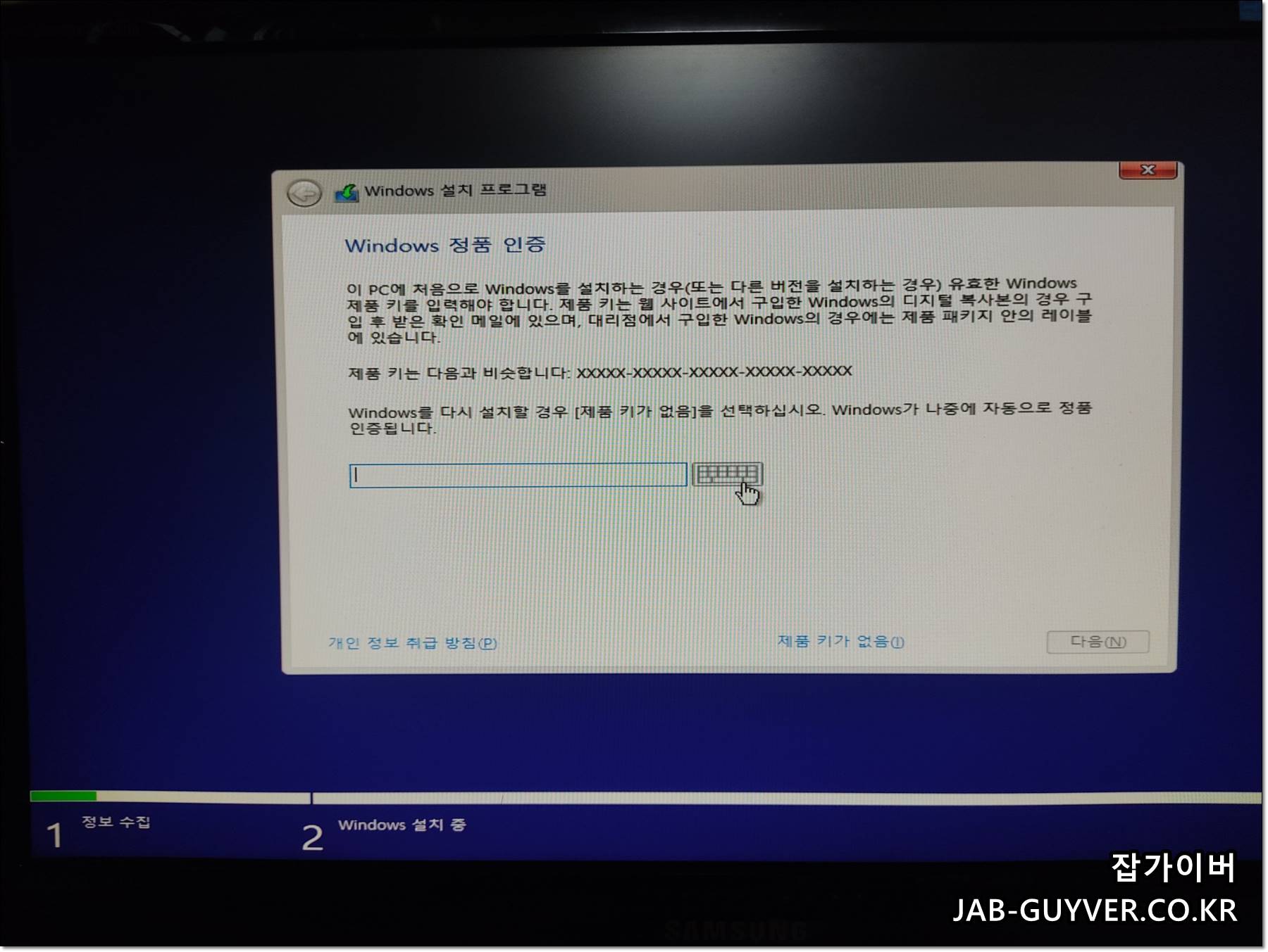 윈도우 설치 시 제품키가 없는 경우 제품 키가 없음을 선택합니다.