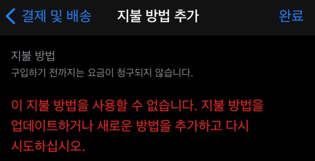 이미지 설명 : 앱스토어 결제 시 대표적으로 등장하는 “이 지불방법은 사용할 수 없습니다” 알림 예시