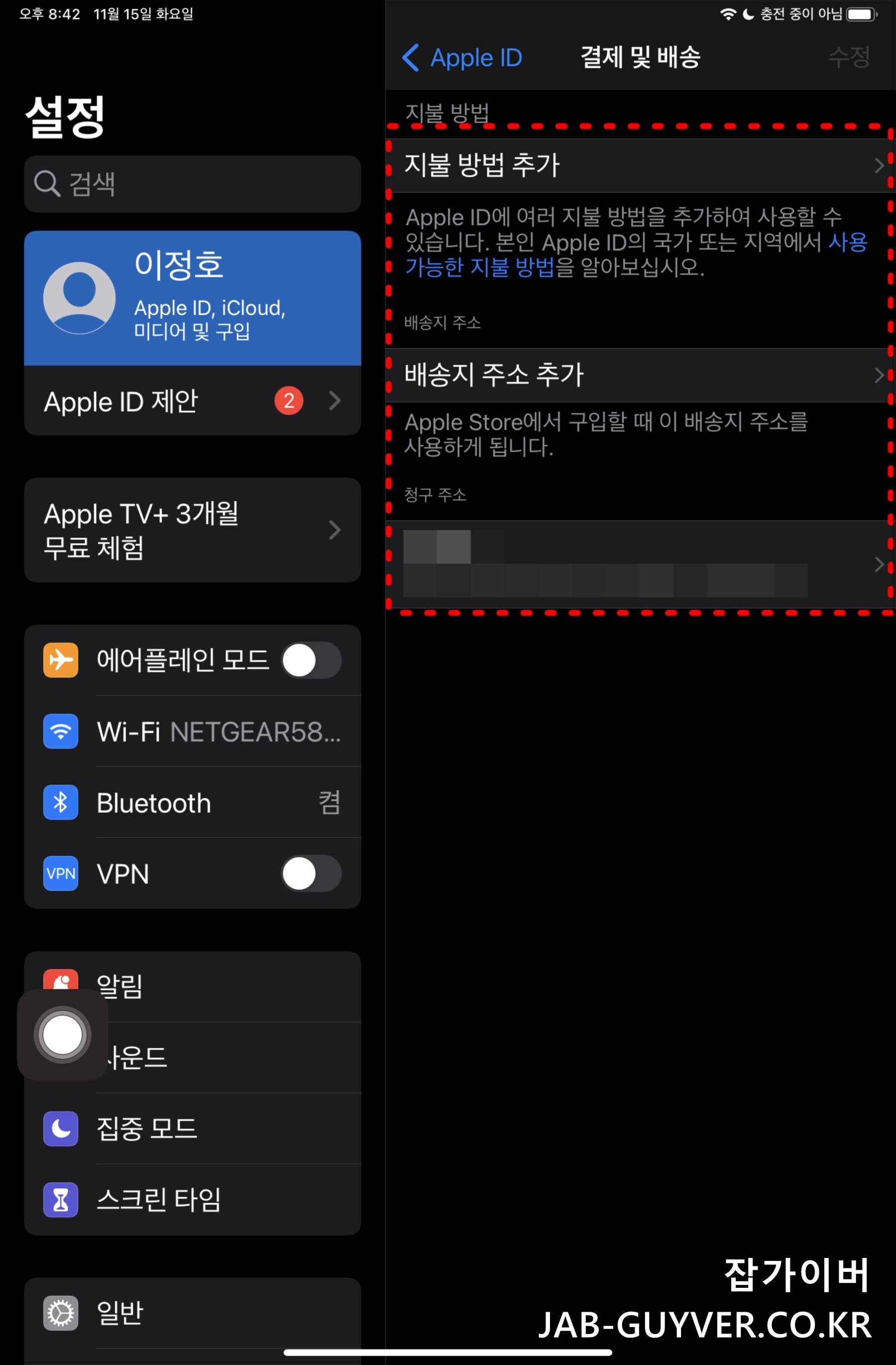 이미지 설명 : iOS 설정에서 Apple ID를 선택한 뒤 결제 및 배송 메뉴로 들어가 지불방법과 주소를 입력하는 화면
