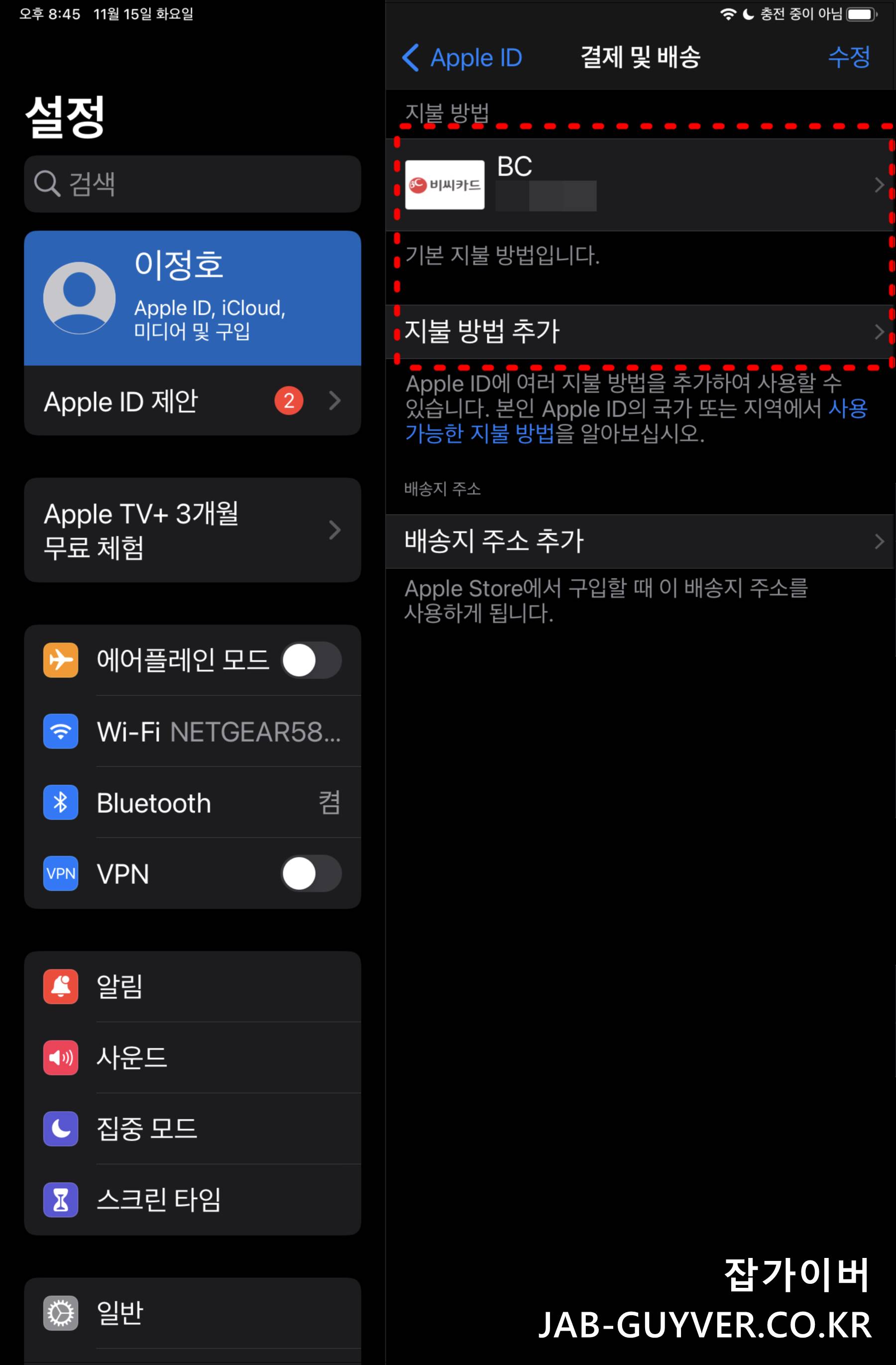 이미지 설명 : iOS 설정에서 Apple ID를 선택한 뒤 결제 및 배송 메뉴로 들어가 지불방법과 주소를 입력하는 화면