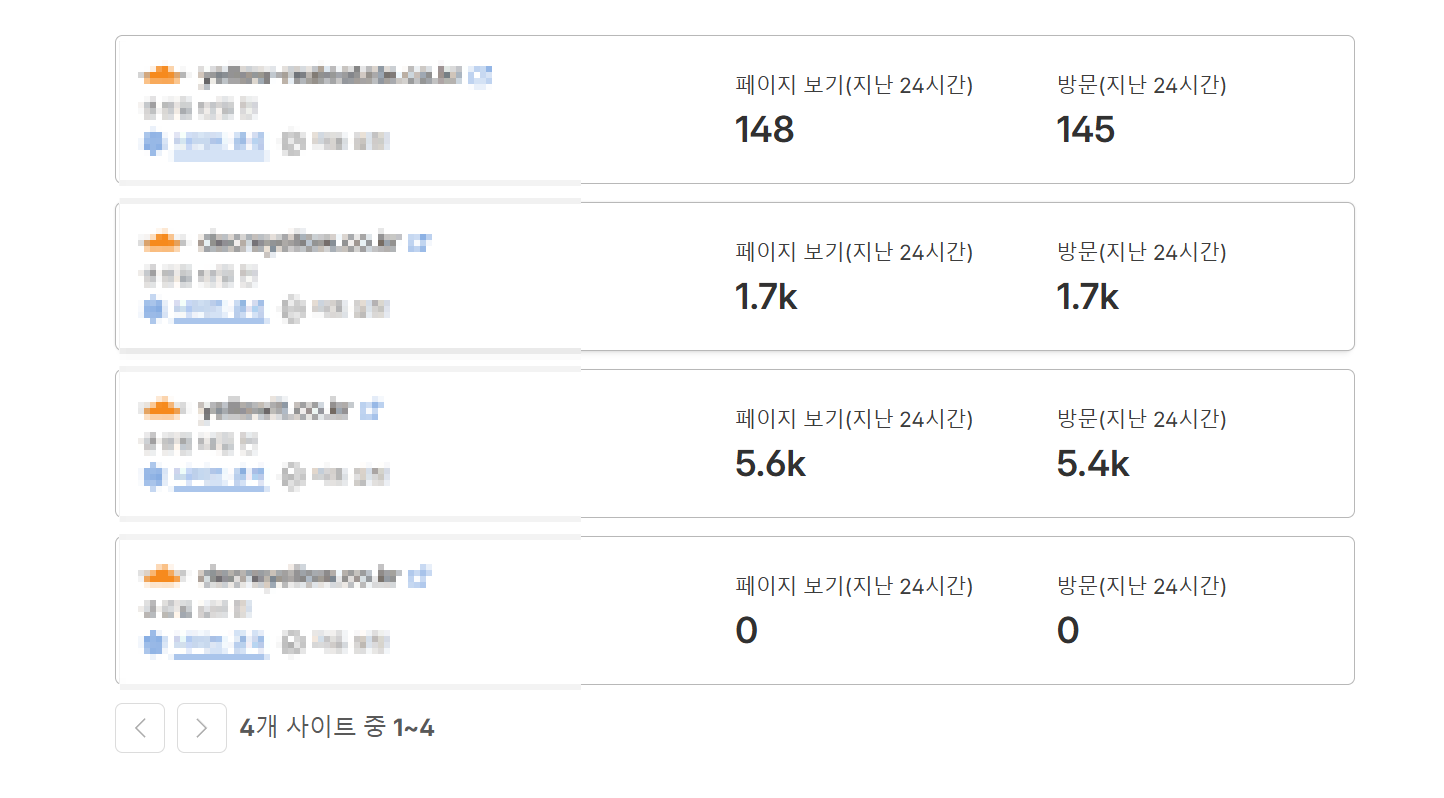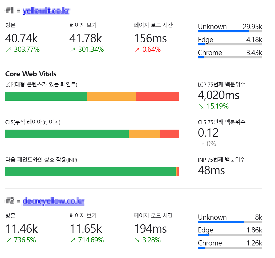 그런데 Cloudflare를 다시 적용하고 APO와 Argo까지 올려 보신 첫 주에 예상하지 못했던 변화가 나타났습니다. 3개의 사이트 모두 방문과 페이지 뷰가 급격히 늘어난 상황에서도 평균 응답 속도는 오히려 안정화됐고, 그동안 발목을 잡던 LCP 지연과 서버 초기 응답까지 함께 개선되는 흐름이 확인되었습니다.