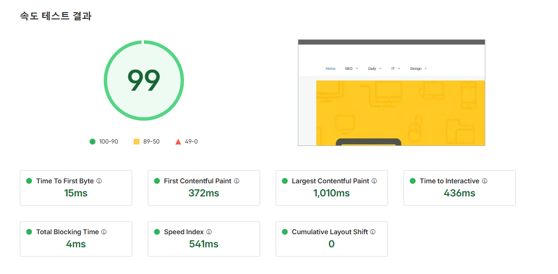 GTmetrix에서 늘 붉은색으로 표시되던 TTFB 항목이 노란색 수준으로 완화되고, 첫 화면이 뜨는 속도가 이전보다 자연스럽게 다가온 순간들이 있었을 것입니다. 단순히 수치만 좋아진 것이 아니라 클릭과 스크롤 같은 동작에서도 반응성이 매끄럽게 이어지며 체감 차이가 확실히 느껴졌습니다.