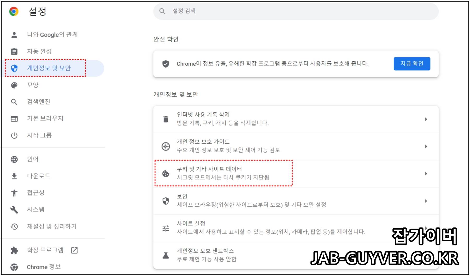 개인정보 및 보안으로 들어가 쿠키 및 기타 사이트 데이터를 선택해 타사 쿠키를 차단설정을 합니다.