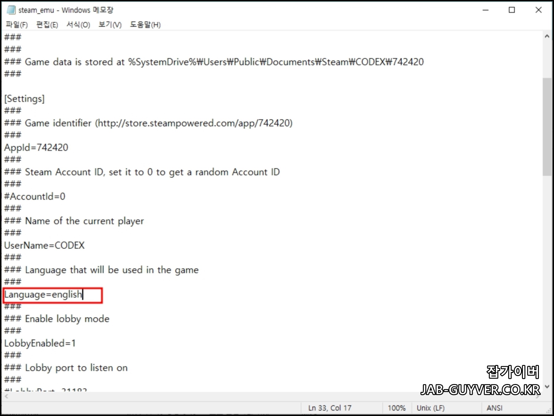steam.emu.ini 파일을 메모장으로 실행합니다.