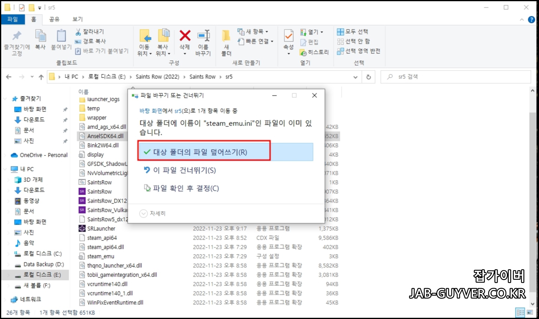 그리고 steam.emu.ini 파일을 종료 후 바탕화면에 저장한 steam.emu.ini 파일을 복사 후 세인츠로우가 설치된 경로에 붙여넣기 합니다.