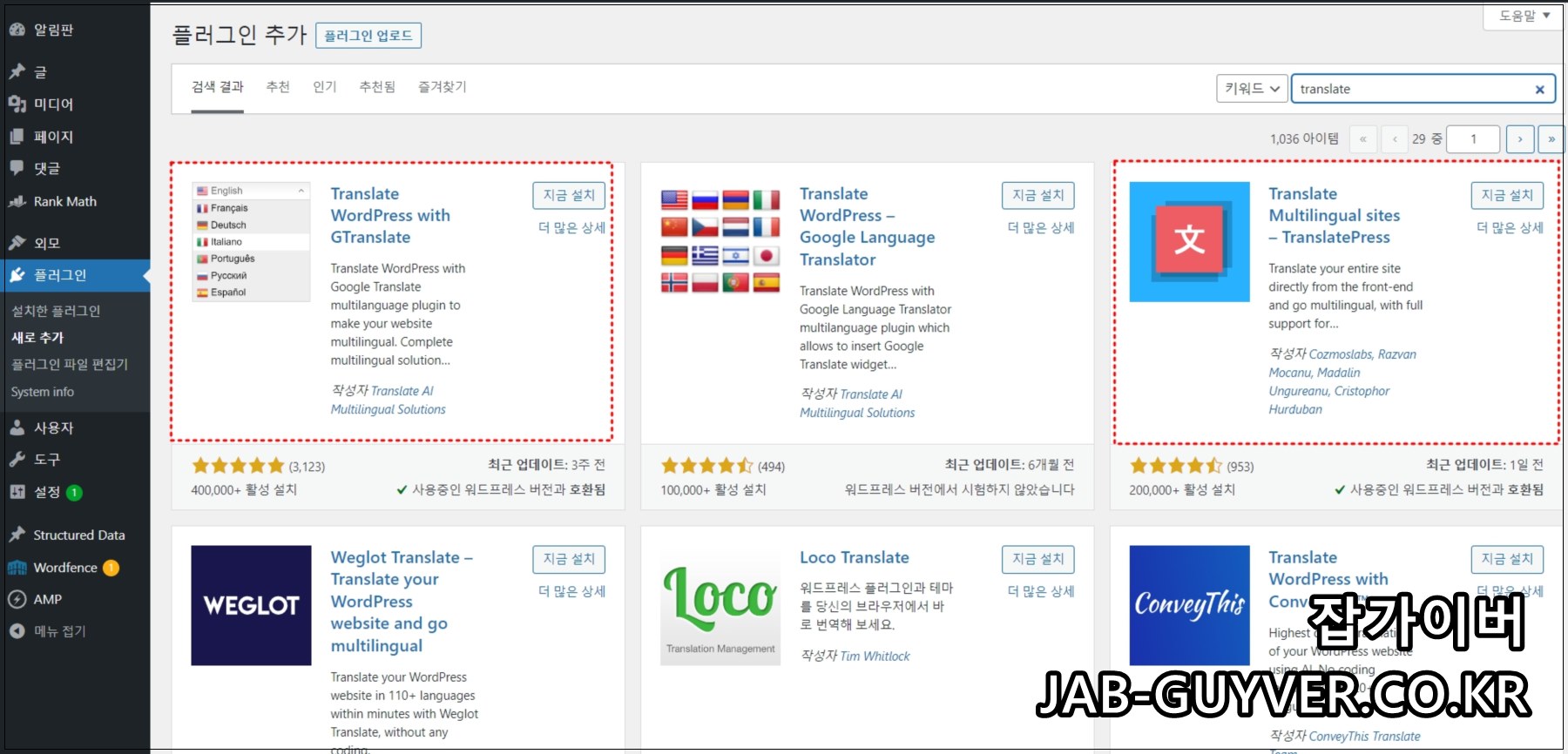 워드프레스플러그인 설치에서 Translate로 검색하면 다양한 번역 플러그인이 보이며 대표적인 번역 플러그인은 4가지가 있습니다.