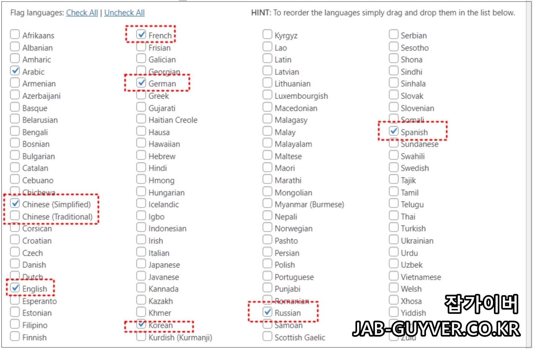 기본적으로 Translate WordPress With GTranslate 플러그인을 통해 자동으로 설정 된 외국어 종류는 아랍어, 중국어, 영어, 프랑스어, 독일어, 러시아어, 스페인어가 있으며 그외에도 우즈베키스탄부터 말레시아, 힌디어 등 다양한 언어를 자동번역해줍니다.