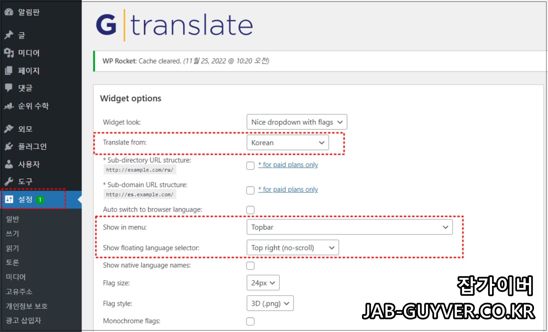 플러그인을 설치 후 설정으로 들어가면 한국어 기준으로 번역을 진행하며 각각에 대한 번역페이지 변경을 할 메뉴를 활성화하거나 비활성화 할 수 있으며 위치도 변경할 수 있습니다.