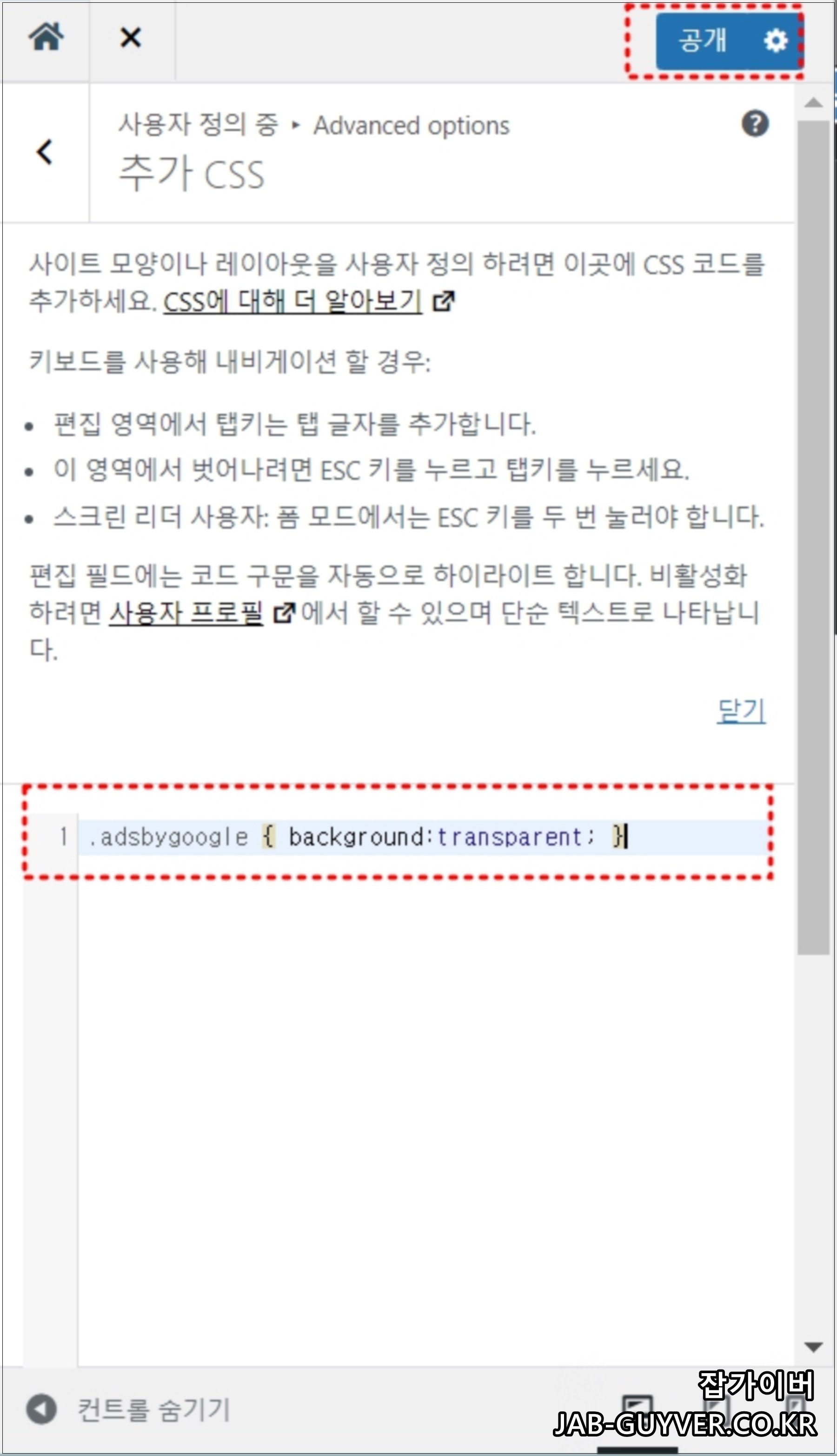 테마디자인 -> 사용자 정의하기 -> 추가CSS에서 아래 코드를 추가합니다.