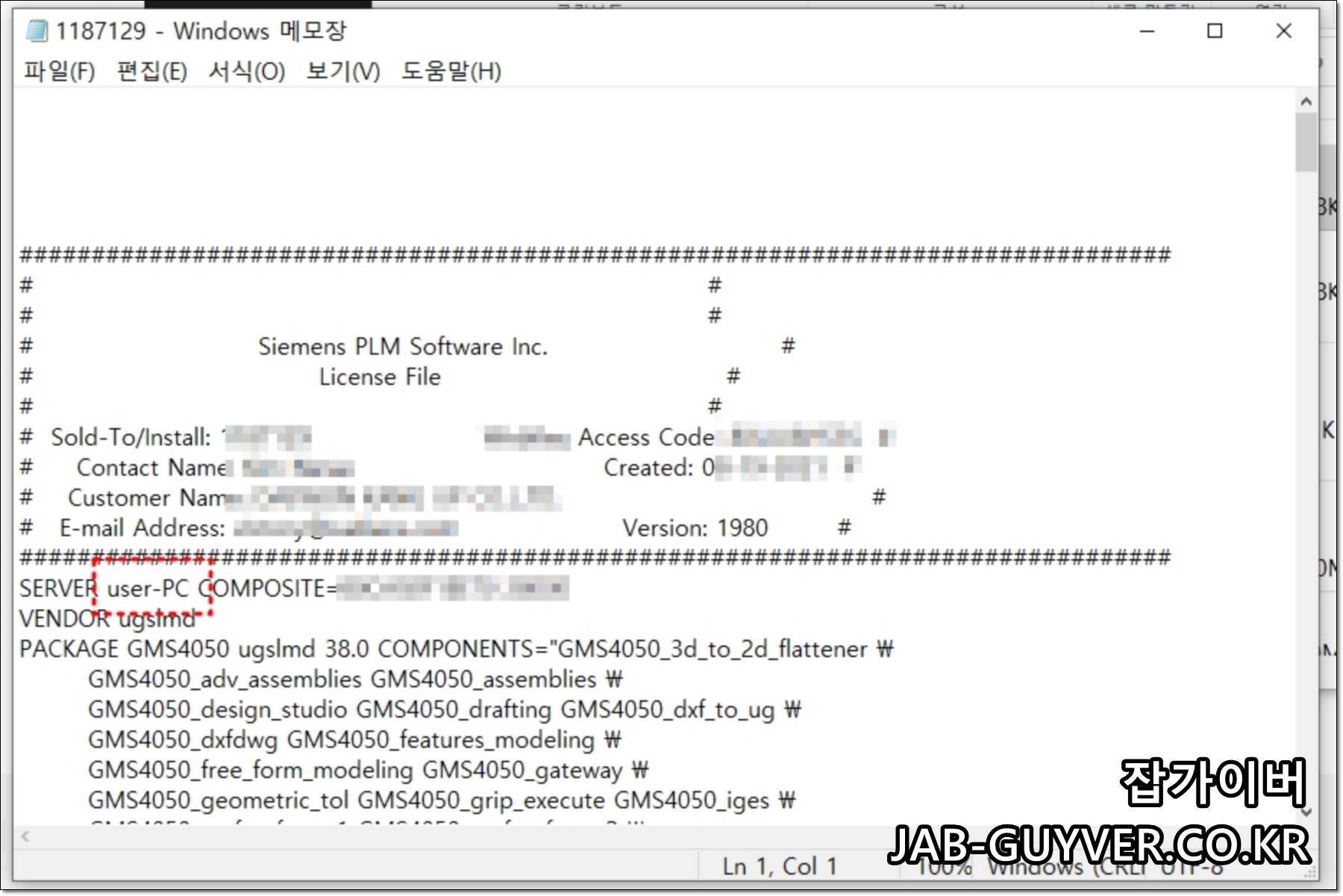 NX 라이센스 파일에 SEVER 이름은 윈도우 호스트 이름으로 설정