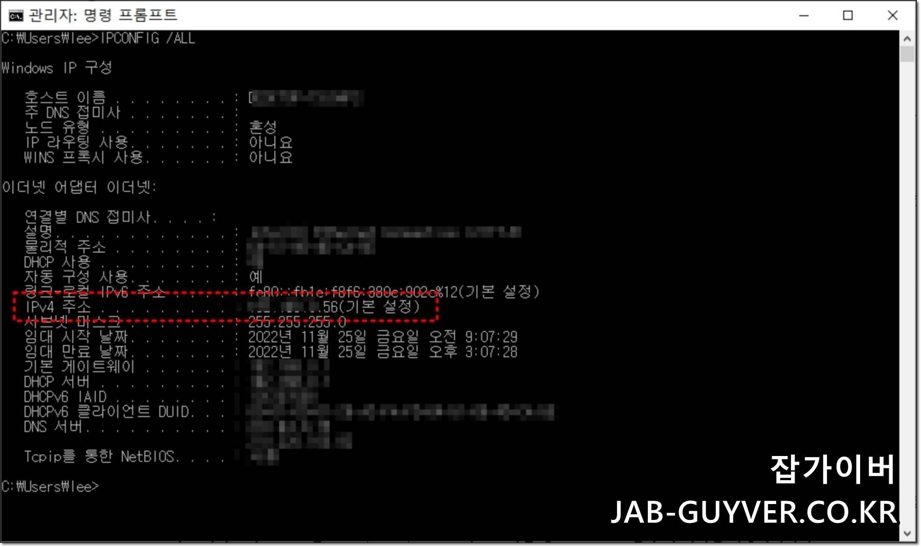 IP주소를 확인하기 위해서는 CMD & 명령프롬프트를 실행 후 아래 명령어를 입력해줍니다.