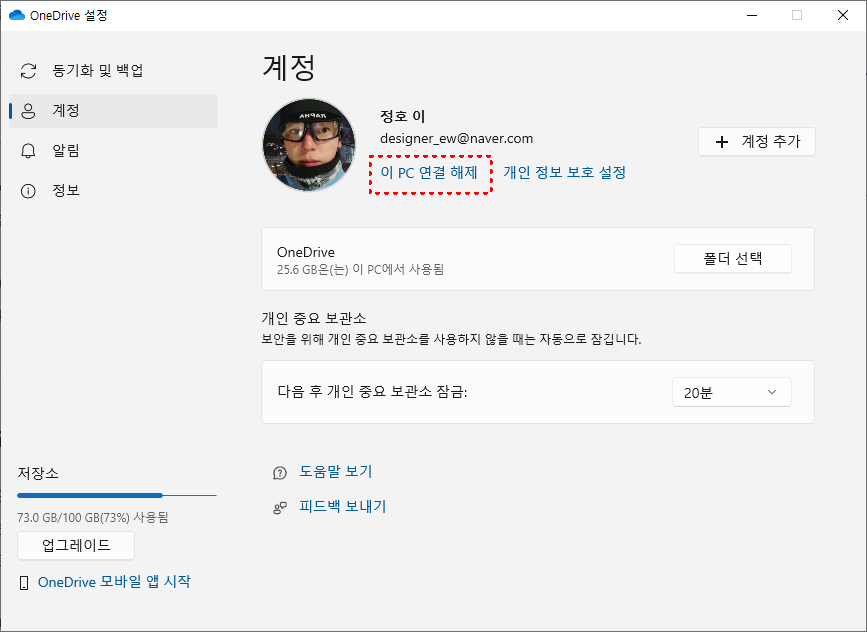 - OneDrive 설정 → 계정 탭 → 이 PC 연결 해제