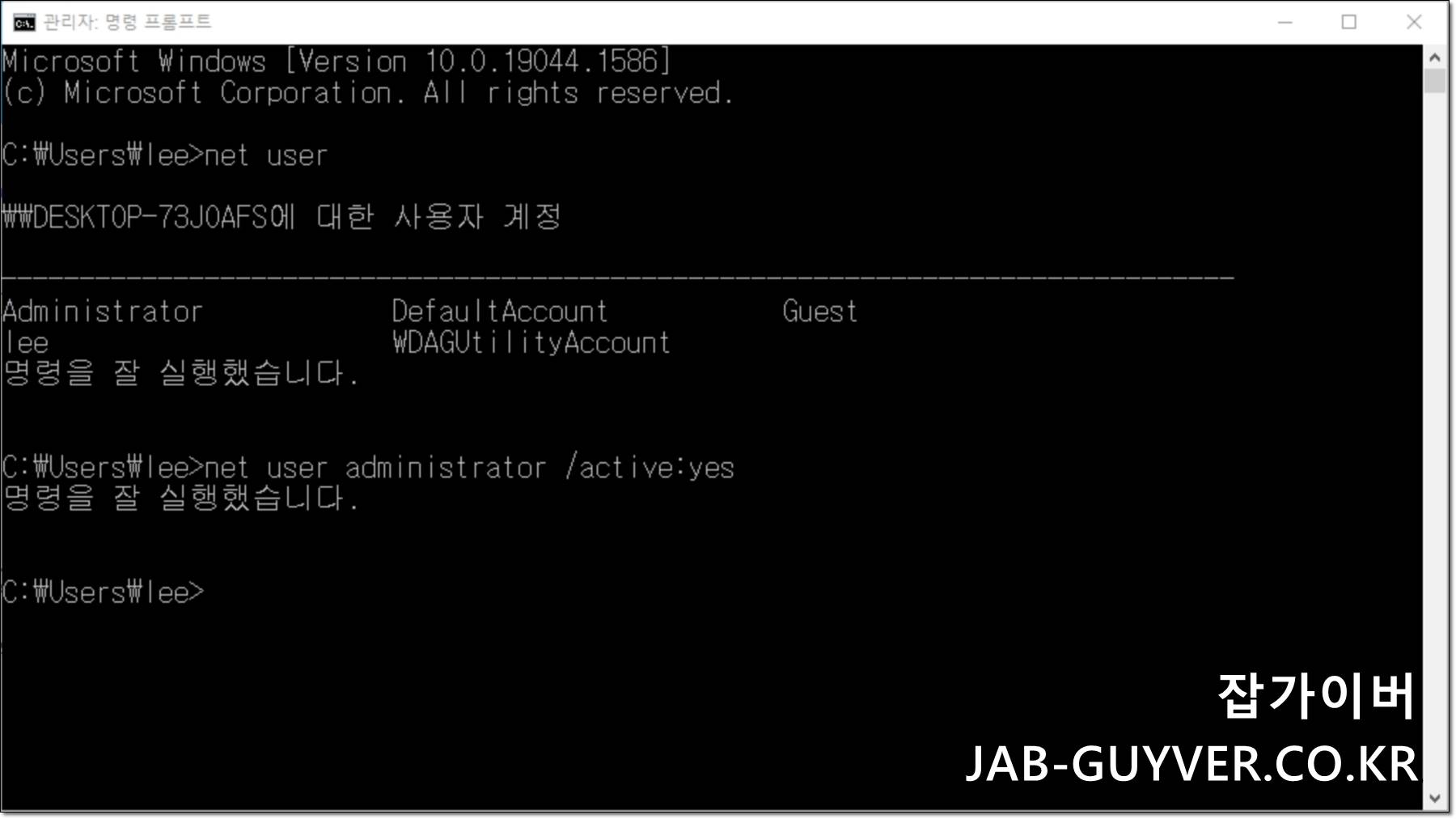 만약 자신의 컴퓨터에 관리자계정을 활성화하고 싶은데 관리자 계정이 비활성화되어 있다면 명령프롬프트를 통해 관리자계정을 활성화합니다.