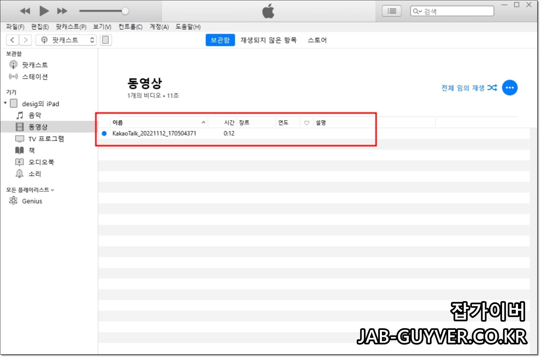 PC에 있는 영상을 아이튠즈 보관함에 넣는 건 단순합니다. 동영상 탭에서 드래그 앤 드롭으로 추가하면 됩니다.
