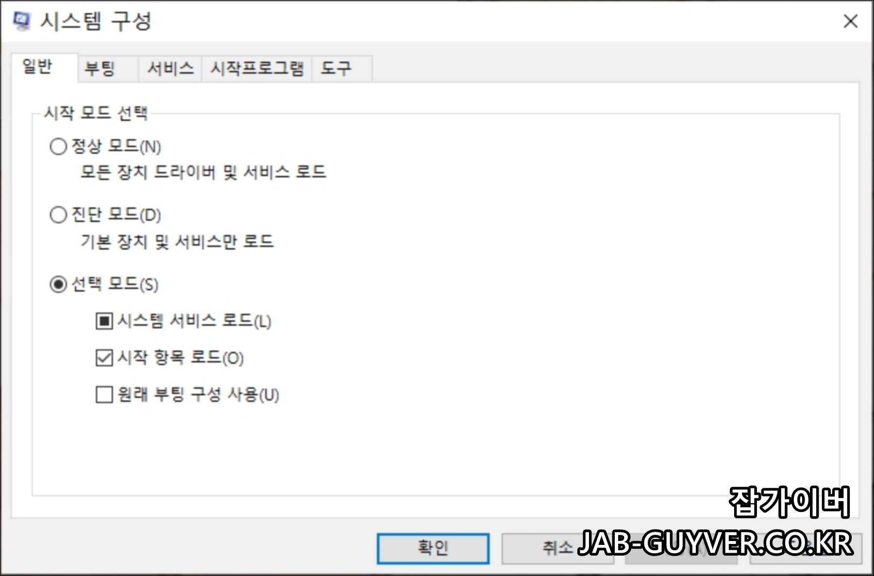 윈도우 로그인까지 가능 MSCONFIG 부팅 탭 안전부팅 체크 해제