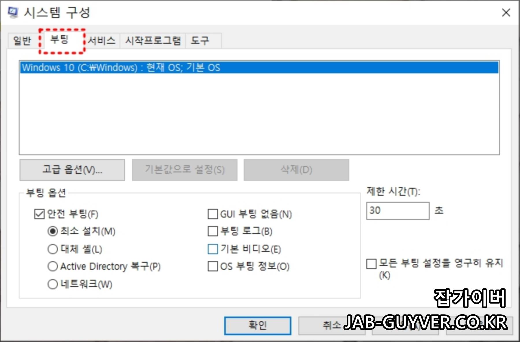 부팅 탭으로 이동한 뒤, 안전부팅으로 체크되어 있는 항목을 해제합니다.